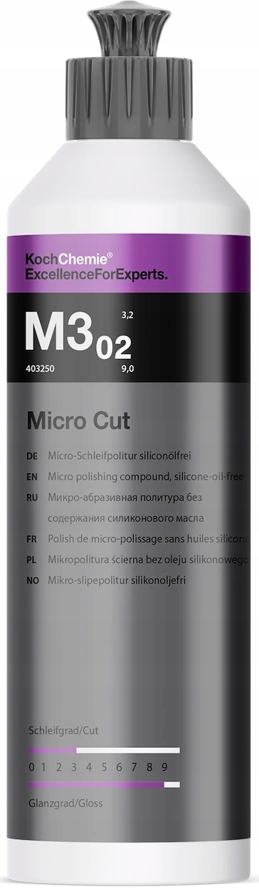 Koch Chemie Micro Cut M3.02 b> – полірувальна паста останнього покоління для остаточного видалення полірувального диму, голограм, делікатних подряпин і матування паперу з градацією до P3000, призначена для всіх типів лаків (включаючи стійкі до подряпин). Використовуючи вузькоспеціалізовані, надзвичайно однорідні абразивні частинки, це дозволяє досягти чудового глянцевого покриття навіть на темних і таких же чутливих колірних тонах в екстремальних умовах освітлення. Голограми і легкі подряпини видаляються механічно і не маскуються на поверхні. Продукт надзвичайно ефективний, простий у використанні, його можна легко та повністю видалити.