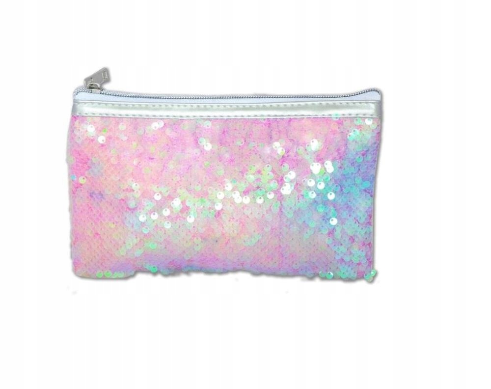 Рожева сумка з блискітками переливається багатьма кольорами завдяки голографічним блискіткам. Його можна використовувати як косметичку або пенал. Закривається на блискавку, має підкладку.