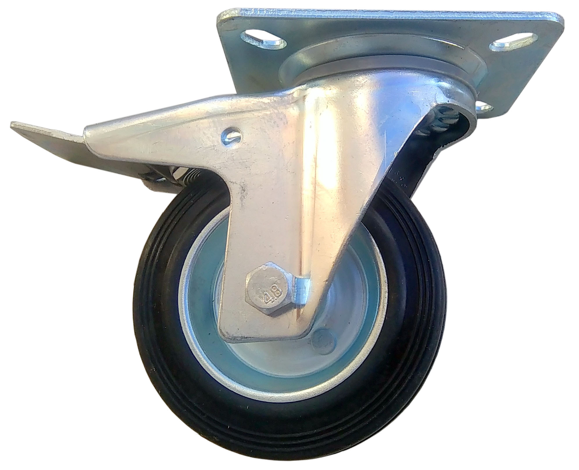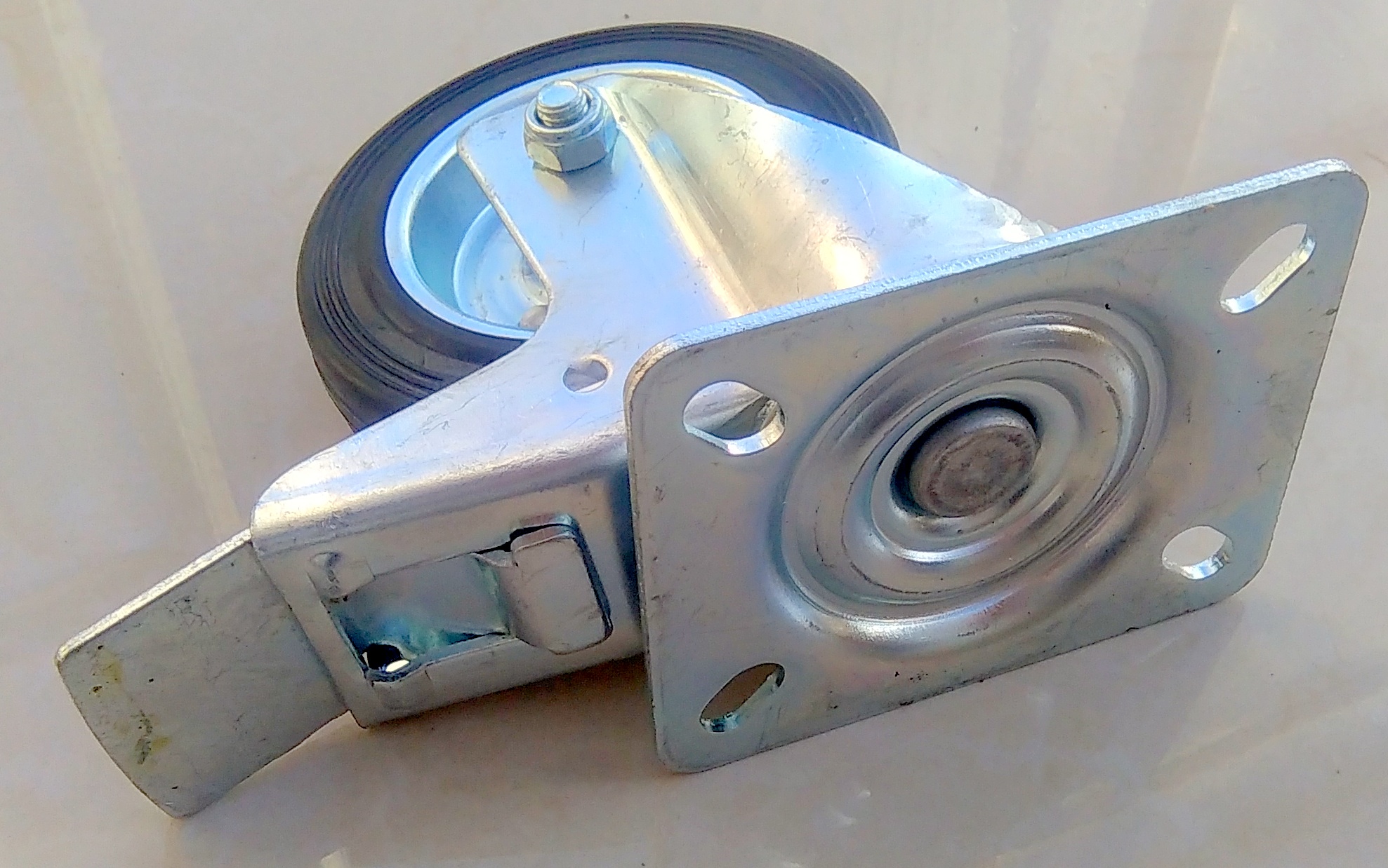 Поворотні колеса встановлені на т.зв Пластина являє собою комбінацію вилки з пресованого сталевого листа і колеса зі сталевою втулкою і шиною з суцільної чорної гуми. Поворотна головка вилки має подвійні підшипники і захищена від бруду спеціальним пиловим ущільнювачем. Всі металеві елементи комплекту покриті антикорозійним хромоцинковим покриттям. Гальмо блокує диск і колесо.