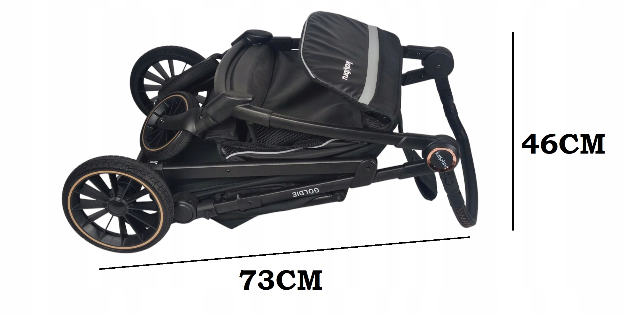 Наша коляска характеризується чорною легкою алюмінієвою рамкою з добавками з рожевого золота збоку коляски та на колесах, що додає чарівності та смаку всієї коляски. Перевага коляски - це широкий дах, який захищає від прямого сонячного світла вашої дитини, а в вітряні дні ефективно захищає від вітру.