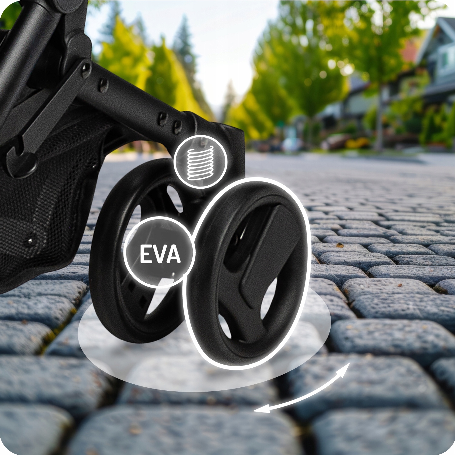 - Передні колеса мають додаткові подушки , що збільшує комфорт водіння дитини та візка під керівництвом батька.