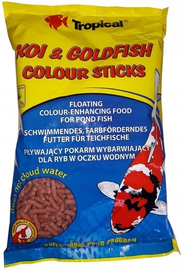 KOI & GOLDFISH COLOR STICKS - це повноцінний корм для покращення кольору у формі плаваючих паличок для всіх різнокольорових коі, золотих рибок та інших різнокольорових декоративних карпових, яких утримують у садових водоймах і ставках.