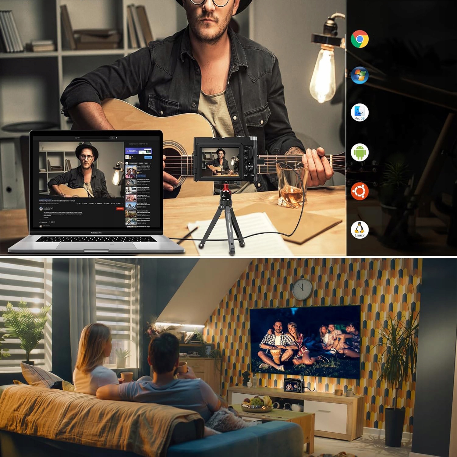 - Ця компактна цифрова камера може використовуватися як веб-камеру, підключивши USB-кабель та перемикаючи камеру в режим веб-камери, ідеально підходить для відео-дзвінків, Live Broadcasts, блогу, відео-блогу, електронного навчання та ін.