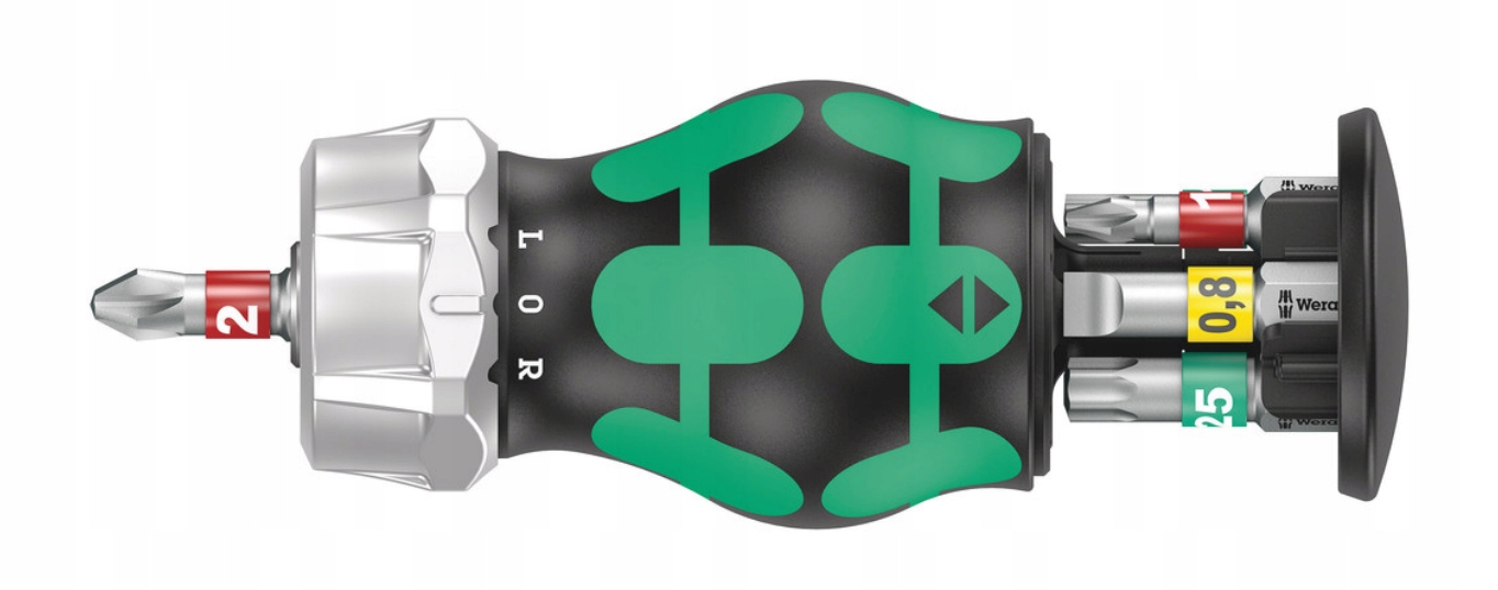 Храповий механізм із дрібними зубами, що забезпечує малий кут повернення собачки. Напрямок загвинчування справа-ліво з фіксатором у середньому положенні можна встановити за допомогою кільця. Магнітний тримач біт підходить для шестигранних біт 1/4 дюйма відповідно до DIN ISO 1173-C 6.3 і Wera серії 1.