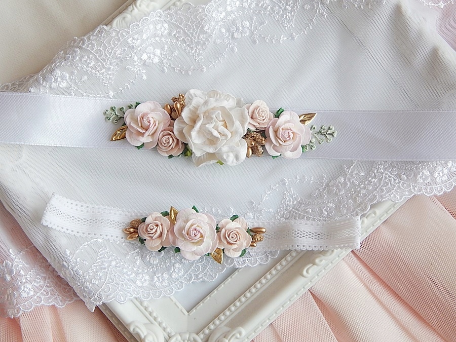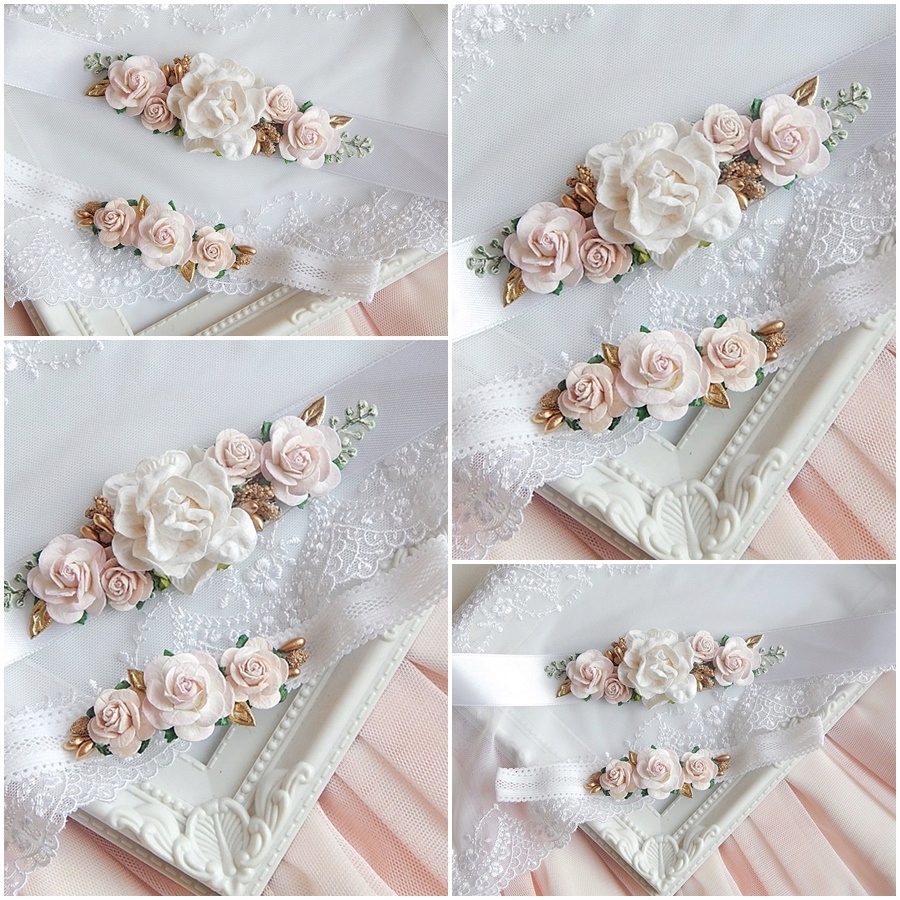 Пов'язка на декоративній резинці білого кольору, прикрашена ніжними квітами. Його нерозтягнутий окружність становить приблизно 36 см