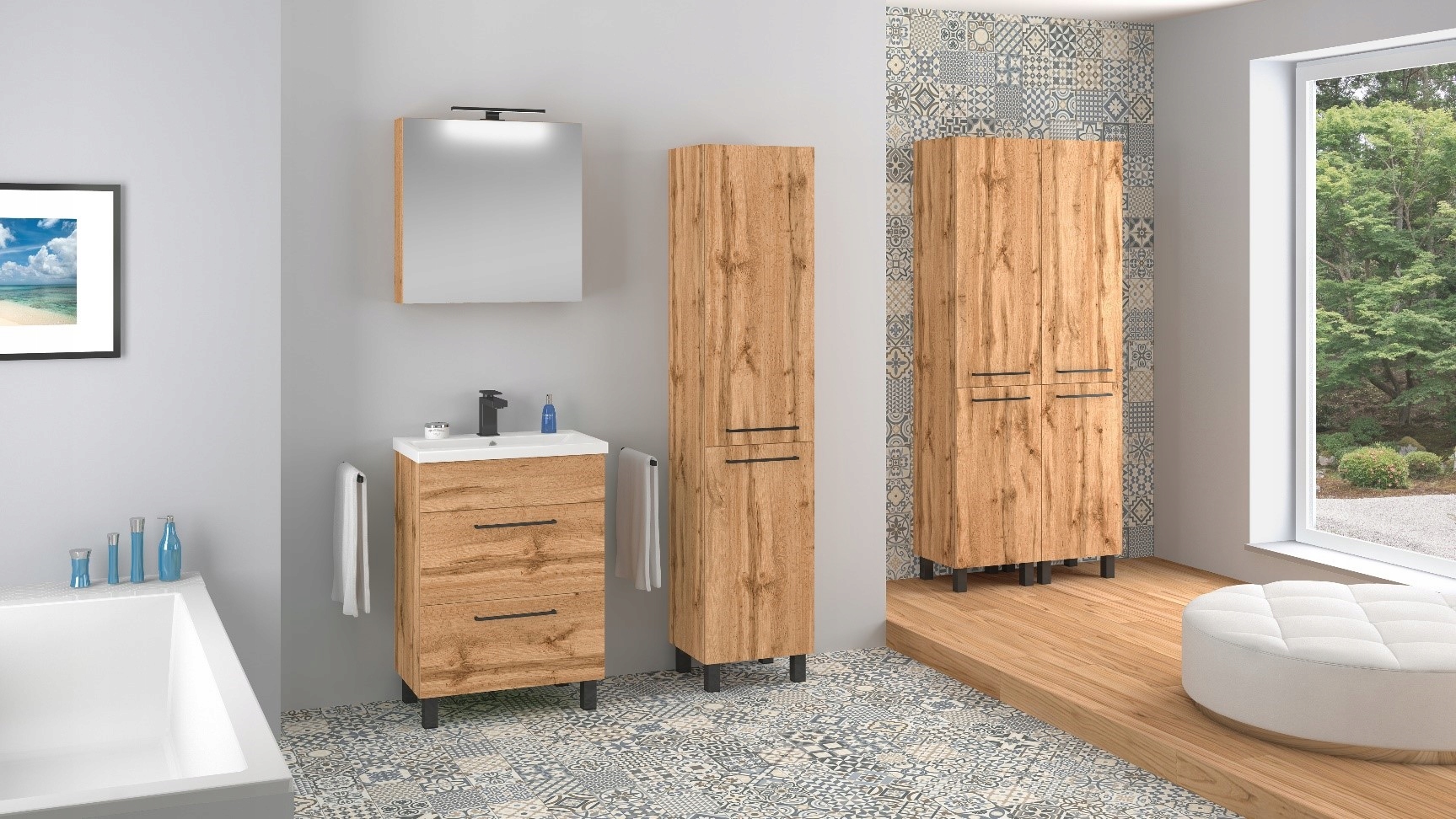 Меблі з колекції sol wotan були створені за допомогою високоякісних матеріалів. Це продукти, які тривалий час зберігають свій ідеальний вигляд. Фронти меблів з колекції Sol Wotan виготовлені з ДСП товщиною 16 мм в Decor Oak Votan. Оздоблення в дерев’яному робочому стільниці дозволяє висвітлити дану кімнату та надати йому унікального персонажа, який є чудовим рішенням насамперед у невеликих ванних кімнатах. Меблеві тіла виготовлені з ДСП у декорі дуба Wotan