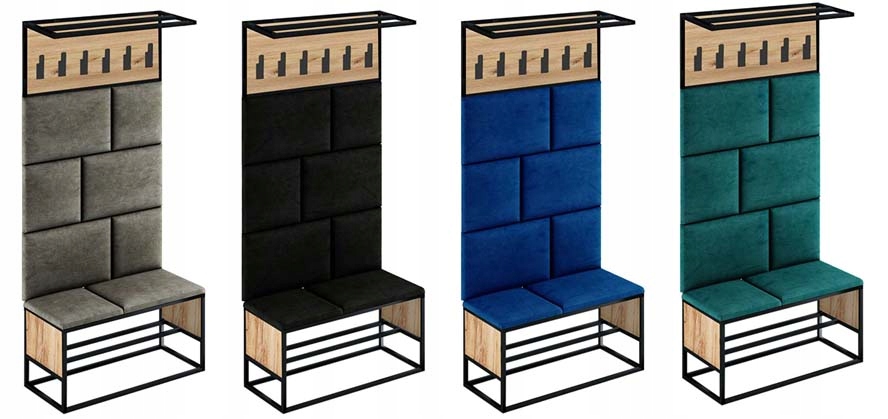 Комплект меблів для передпокою Loft PW - це сучасне та оригінальне рішення для тих, хто хоче створити неповторне облаштування свого холу. Металевий каркас тумби для взуття і матова чорна вішалка, а також панелі, оббиті високоякісною оксамитовою тканиною, підкреслюють індустріальний характер і радують простотою форми. Вішалка має шість гачків, закріплених на меблевому щиті з золотого дуба. Ви можете легко розмістити на ньому всі свої куртки та пальта, а під сидінням шафи можна помістити до восьми пар взуття! Ви можете придбати додаткові панелі до набору, створивши набір відповідно до ваших потреб.