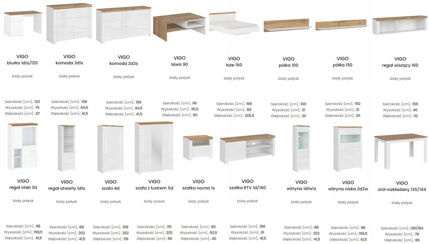 Колекція VIGO є тонкий, але потужний і привабливий. Тверда статура і виступаючі ніжки не применшують їх чарівності, елегантності та делікатності. Поєднання дуба з білими фасадами створює колекції теплого відтінку, які скрасять будь-який інтер’єр. Окрім бездоганного зовнішнього вигляду, їхньою перевагою є також місткість, яка задовольнить усіх домочадців.