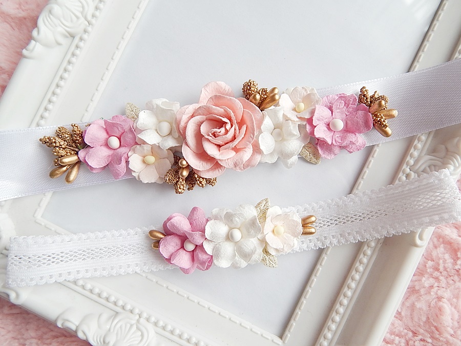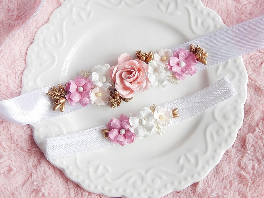 Пов'язка на декоративній білій гумці, прикрашена ніжними квітами. Його нерозтягнутий окружність становить приблизно 36 см