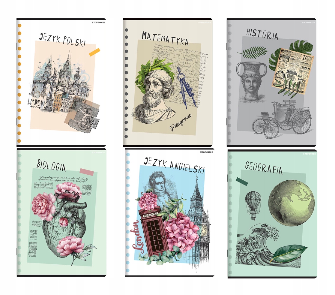 Набір із 6 зошитів для (1) польської мови, (2) математики, (3) англійської мови, (4) історії, (5) біології, (6) географії, А5, 60 аркушів