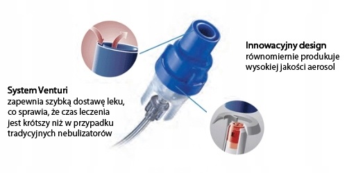 - Спеціально розроблений розпилювач Diamond Jet забезпечує ефективне виробництво аерозолю. В атомайзері є 5 окремих каналів. Один посередині і чотири навколо нього. Повітря проходить через центральний канал, а інші чотири містять рідину для розпилення. Потік повітря створює негативний тиск, захоплюючи краплі рідини, утворюючи аерозоль препарату для розпилення.