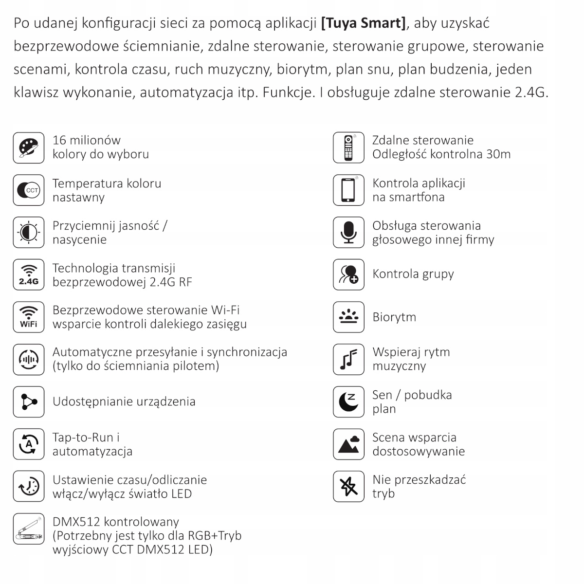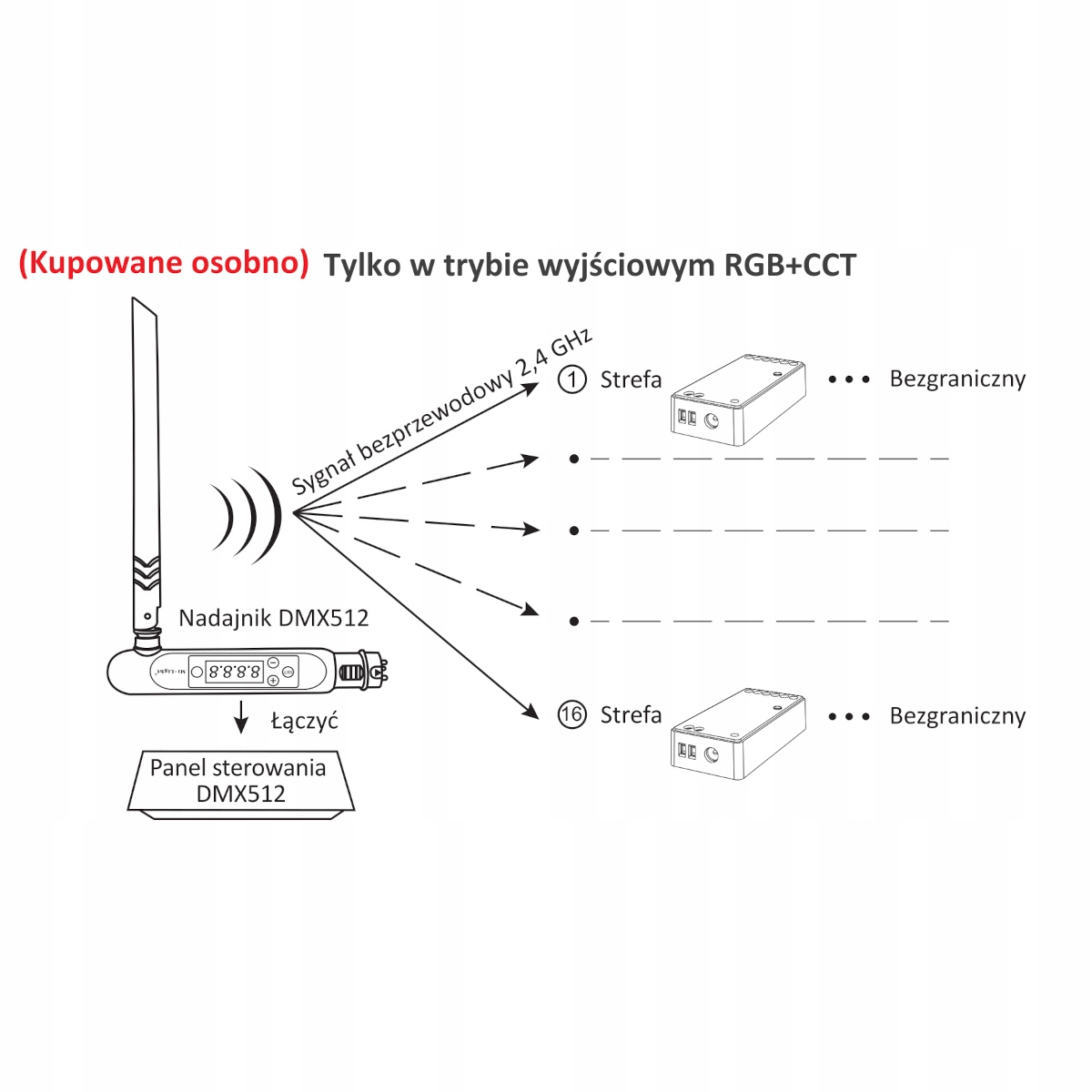спроектований для керування світлодіодними стрічками RGB, RGBW або RGB+CCT безпосередньо за допомогою телефону або спеціального пульта дистанційного керування управління (або DMX - інформація в доданому посібнику). Напруга живлення для контролера - DC 12-24V, максимальний струм 12A.