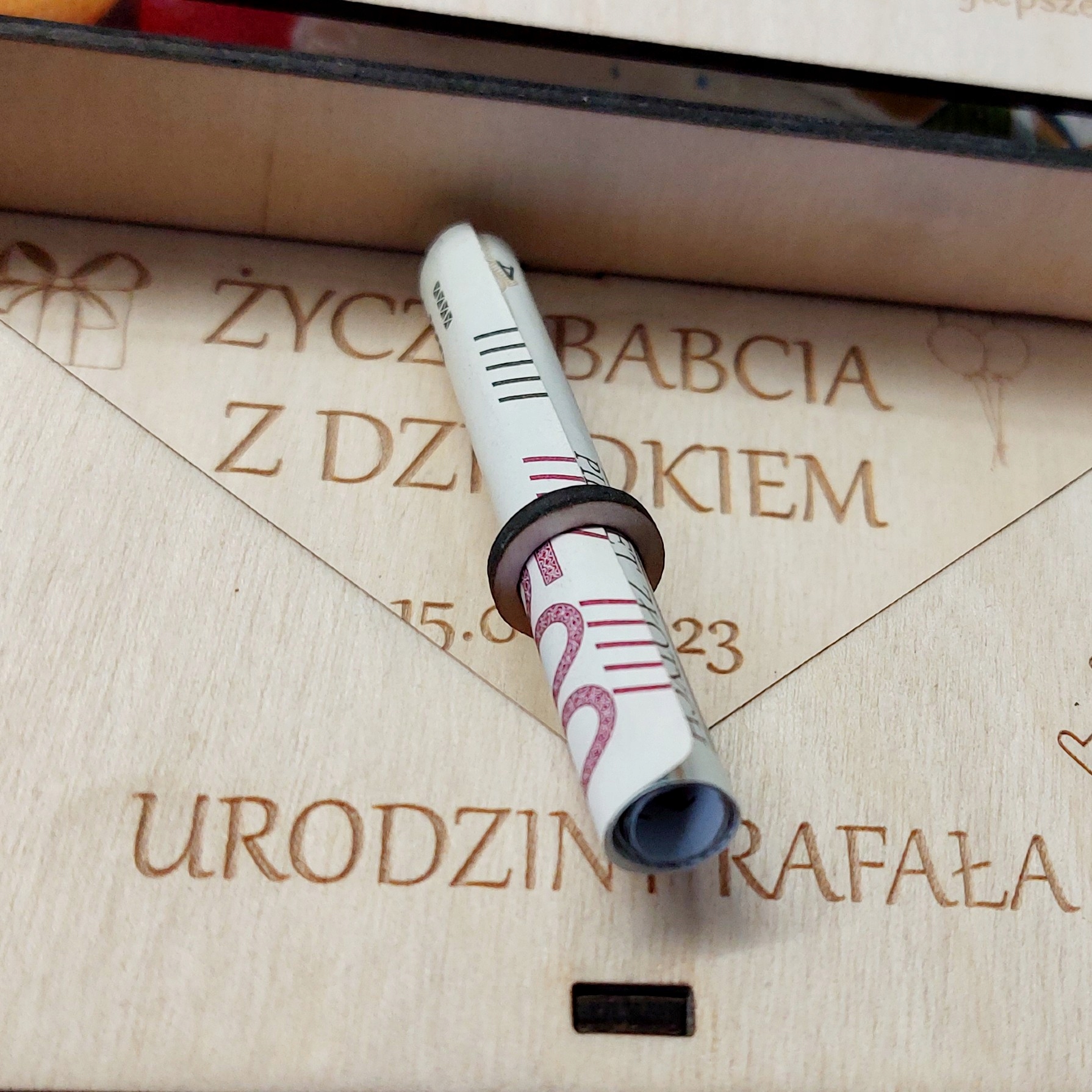 Елегантний дерев’яний конверт виготовлений з високоякісної натуральної деревини (берези). Його вирізають лазером, а потім рукають. Банкноти та інші невеликі подарунки вміститься в конверт. Як безкоштовно, ми додаємо 5 ПК у поле. Круглі ободи/кілець для банкнот!