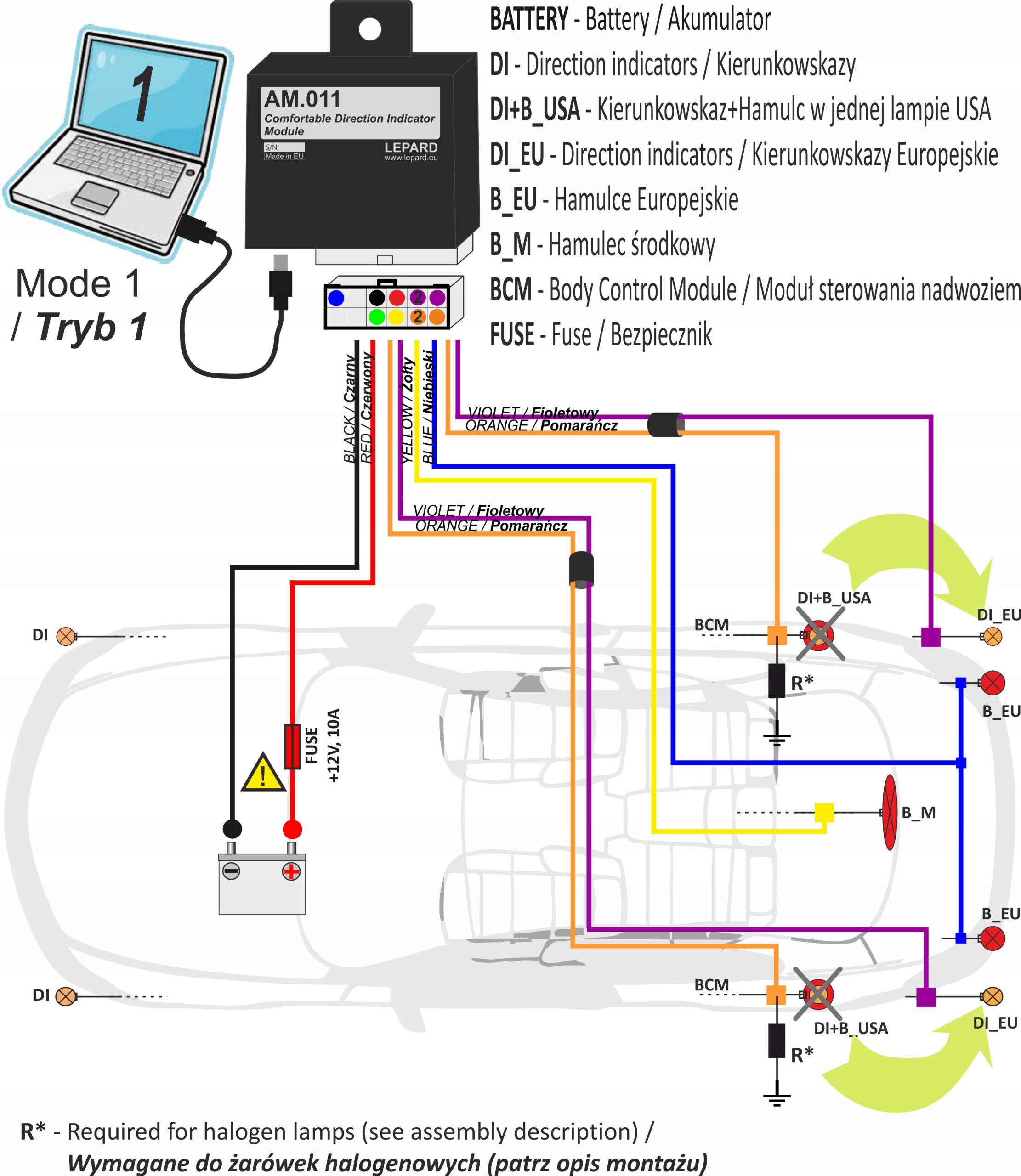 Модуль AM.011.6 розділяє ці вогні на окремі виходи для стоп-сигналів і покажчиків повороту відповідно до європейських вимог.