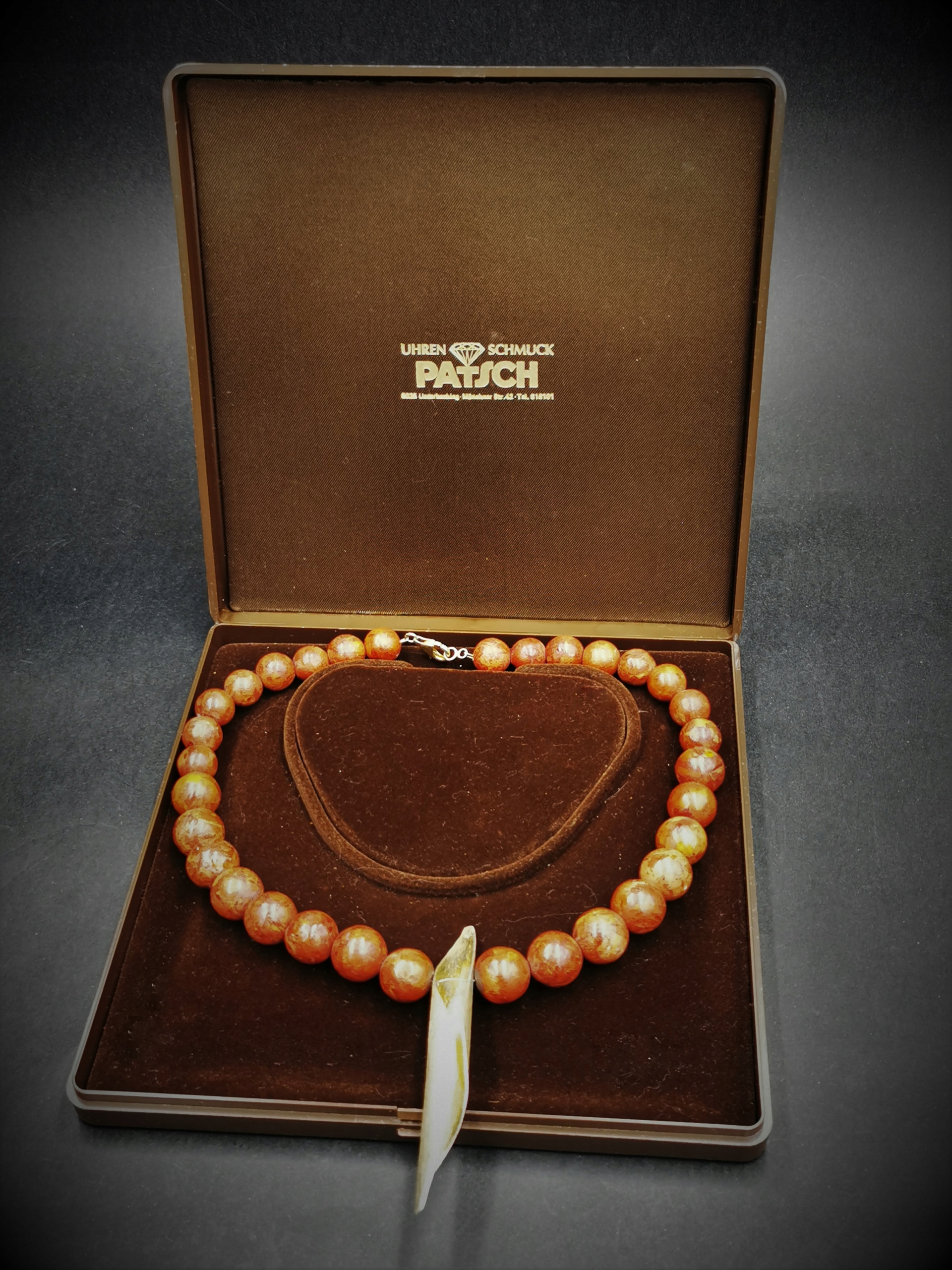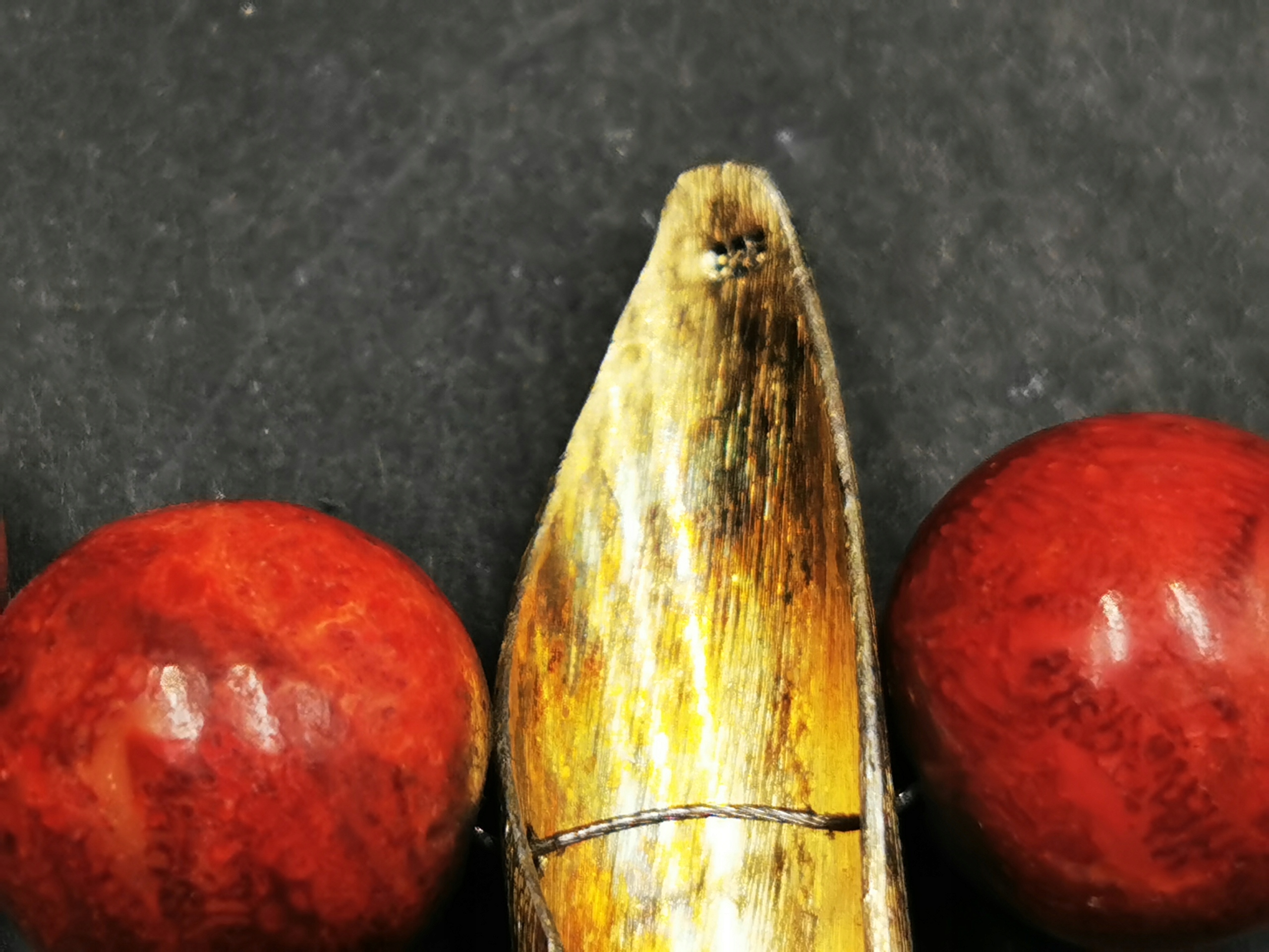 Представлене намисто надзвичайно та елегантне. Він виготовлений із нитки намистин з коралового коріння та прикраси з позолоченого срібла, що нагадує згорнутий пергамент.