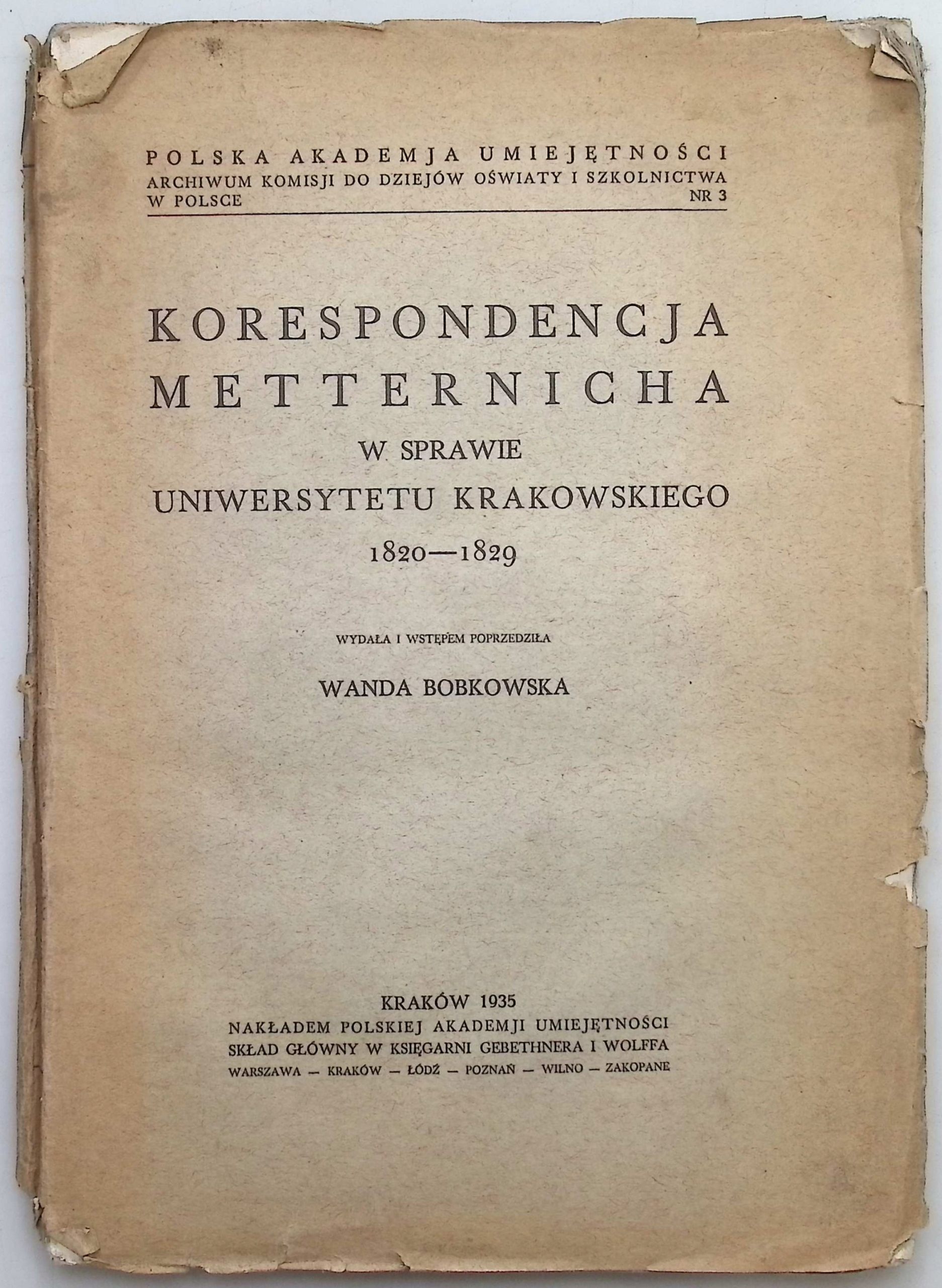 Korespondencja Metternicha w sprawie Uniwersytetu Krakowskiego (1935 r.)