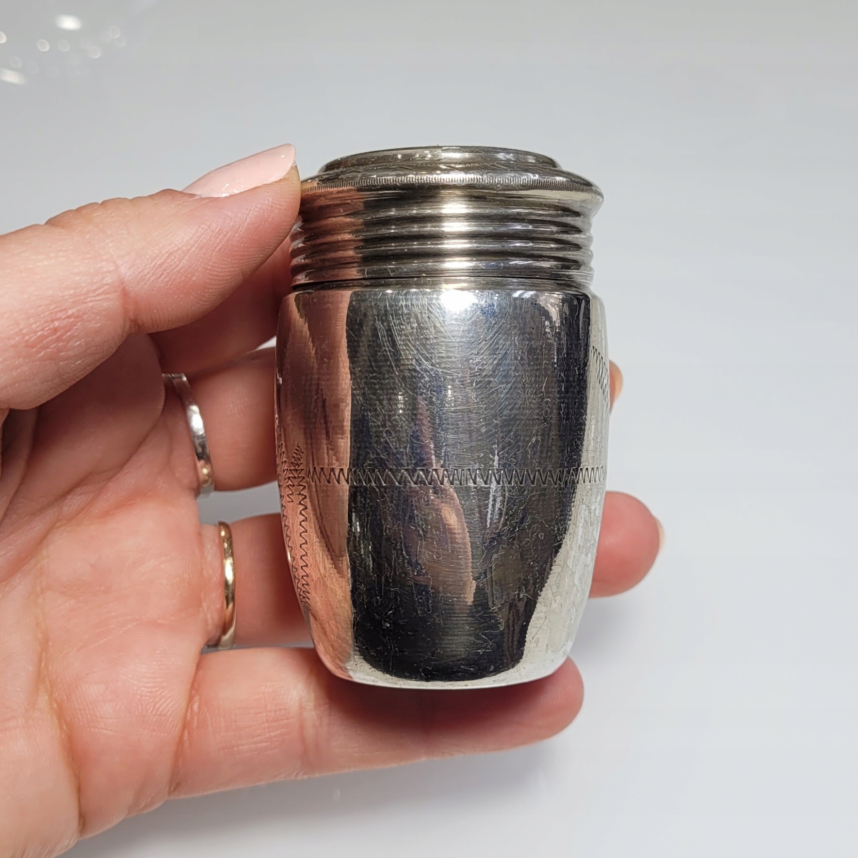 Предмет продажу срібна ємність, що загвинчується, з ручним гравіюванням мотиву птаха на кришці
