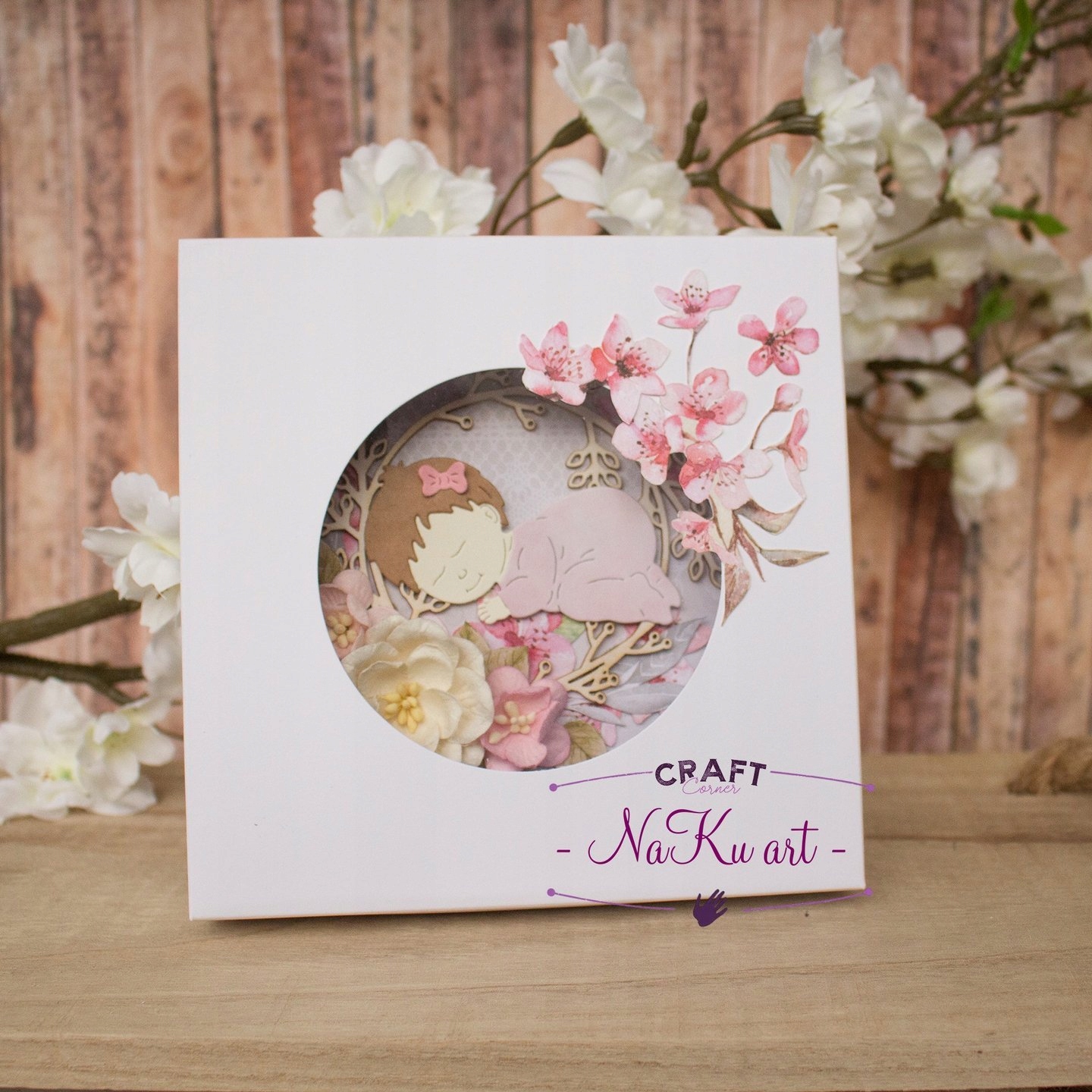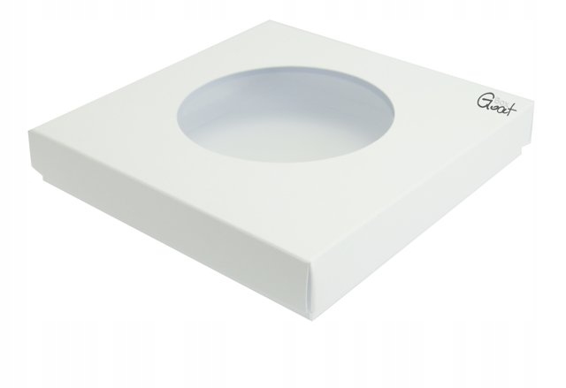 У неї поміститься квадратна листівка 13,5x13,5 см або інший подарунок чи предмет, розміри якого не перевищують. Виготовляється на матриці, на пресі. У комплект входить прозора накладка з ПВХ, вирізана за розміром, товщиною 0,3 мм, не вимагає склеювання, тримається на «носах» коробки. Діаметр отвору 8,9 см