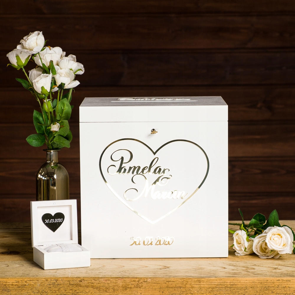 - Надійна конструкція скриньки з дерева в поєднанні з красивим дзеркальним акцентом з іменами нареченого та нареченої