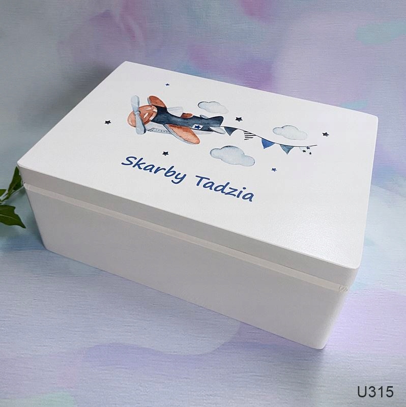 Дерев’яна коробка з зовнішньої пофарбованої білої кришки з барвистим принтом безпосередньо на коробці, назва персоналізації