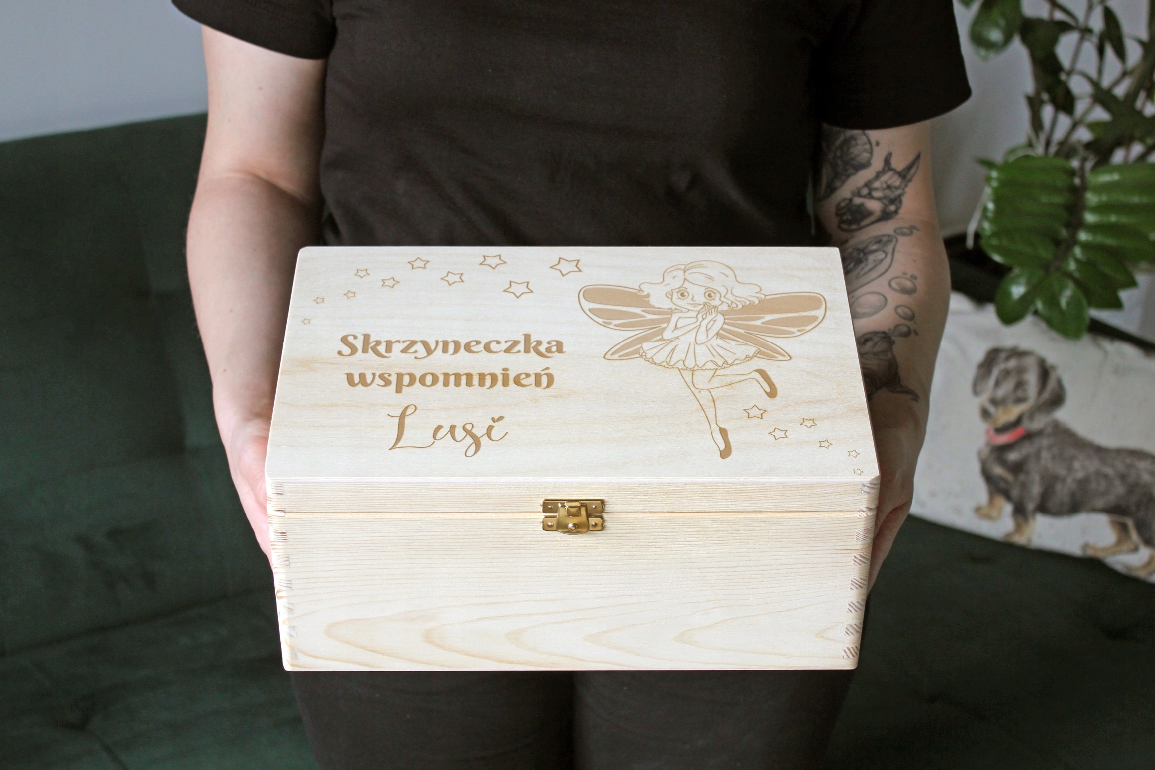 Дитинство - це час, сповнений чудес і невеликих великих моментів, які заслуговують на запам'ятовування. Перші малюнки, улюблені дрібнички або фотографії з важливих подій - все знайде своє місце в цій унікальній меморіальній коробці. Виготовлений з сосни, прикрашеної відданою могилою та чарівною казковою графікою, приносить трохи дитячої магії повсякденному житті. Закрито засувкою, він безпечно зберігатиме всі скарби дитини і зробить найкрасивіші спогади завжди у вас під рукою.