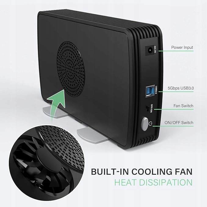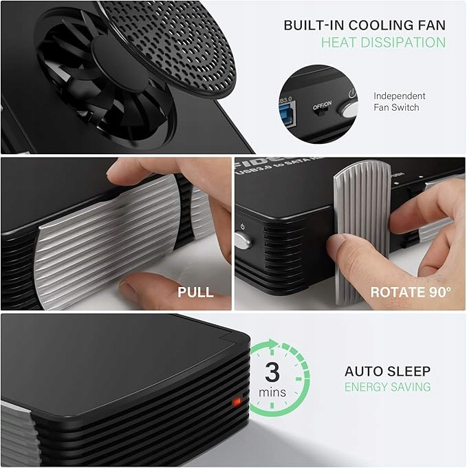 - Вбудований вентилятор охолодження: док-станція FIDECO HDD має вбудований вентилятор охолодження, який забезпечує відмінне розсіювання тепла для вашого жорсткого диска або твердотільного накопичувача. Для міні-вентилятора є незалежна кнопка живлення, тому ви можете вмикати/вимикати охолоджуючий вентилятор у будь-який час відповідно до ваших потреб. Крім того, весь корпус жорсткого диска виготовлено з вишуканого алюмінію, він міцний у використанні