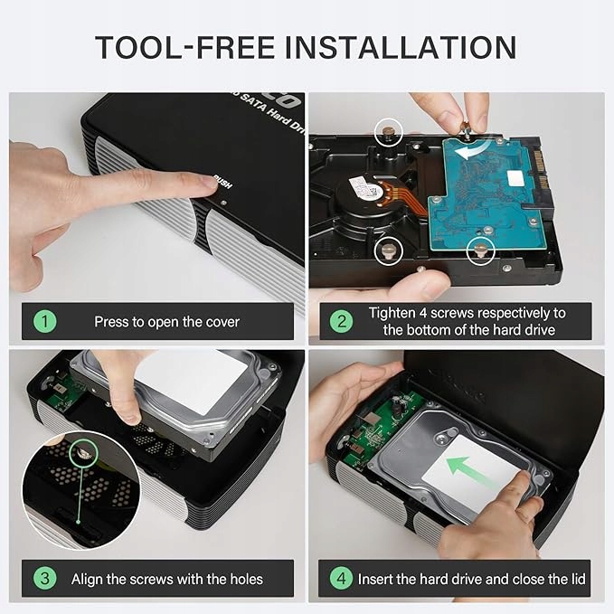 - Збірка без інструментів. Корпус жорсткого диска FIDECO можна легко встановити без інструментів. Просто затягніть 4 гвинти відповідно до нижньої частини жорсткого диска, а потім вставте жорсткий диск у корпус. Водій не потрібен! Просто підключи та працюй.