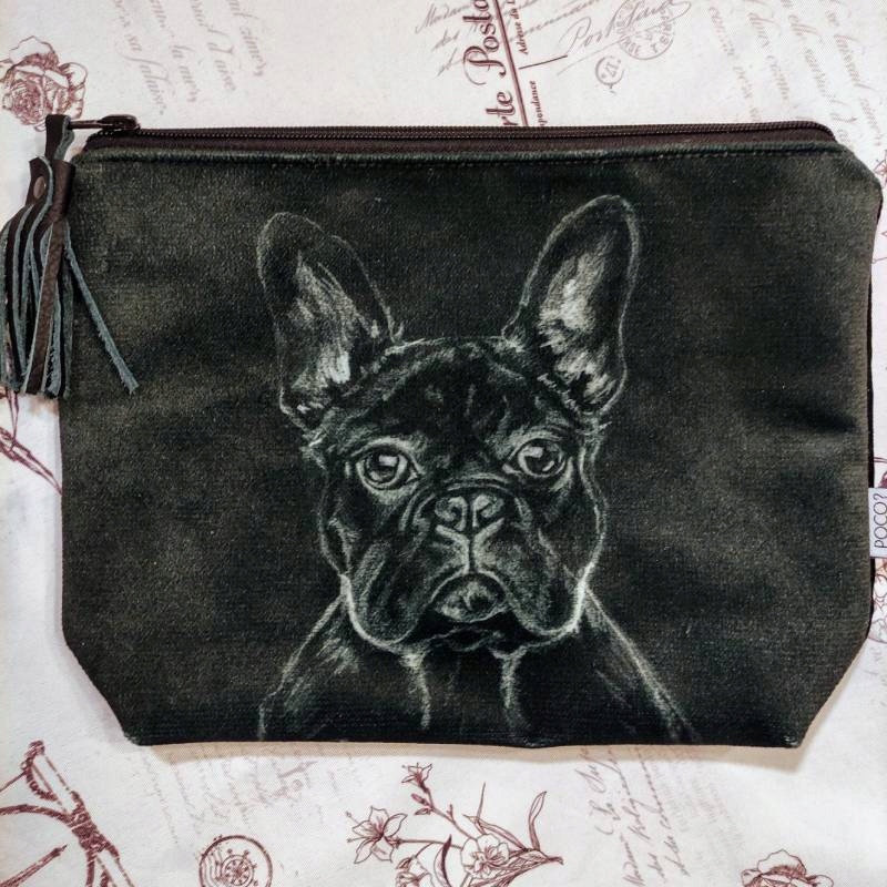 Елегантна оксамитова косметичка, розміри приблизно 30x24 см, з друкованим малюнком чарівний французький бульдог! Однозначно для любителів собак та інших ;) Він створений відповідно до тенденції «нуль відходів» у проекологічному дусі. Більшість матеріалів, які використовуються для пошиття косметички, походять із переробки, тобто зі швейного цеху та оббивної фабрики.