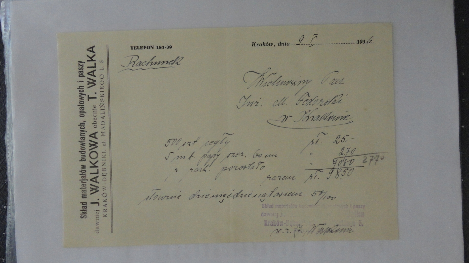 KRAKOW DEBNIKI MADALINSKIEGO WLAKOWA SKLAD MATERIALOW RACHUNEK 1936 ROK