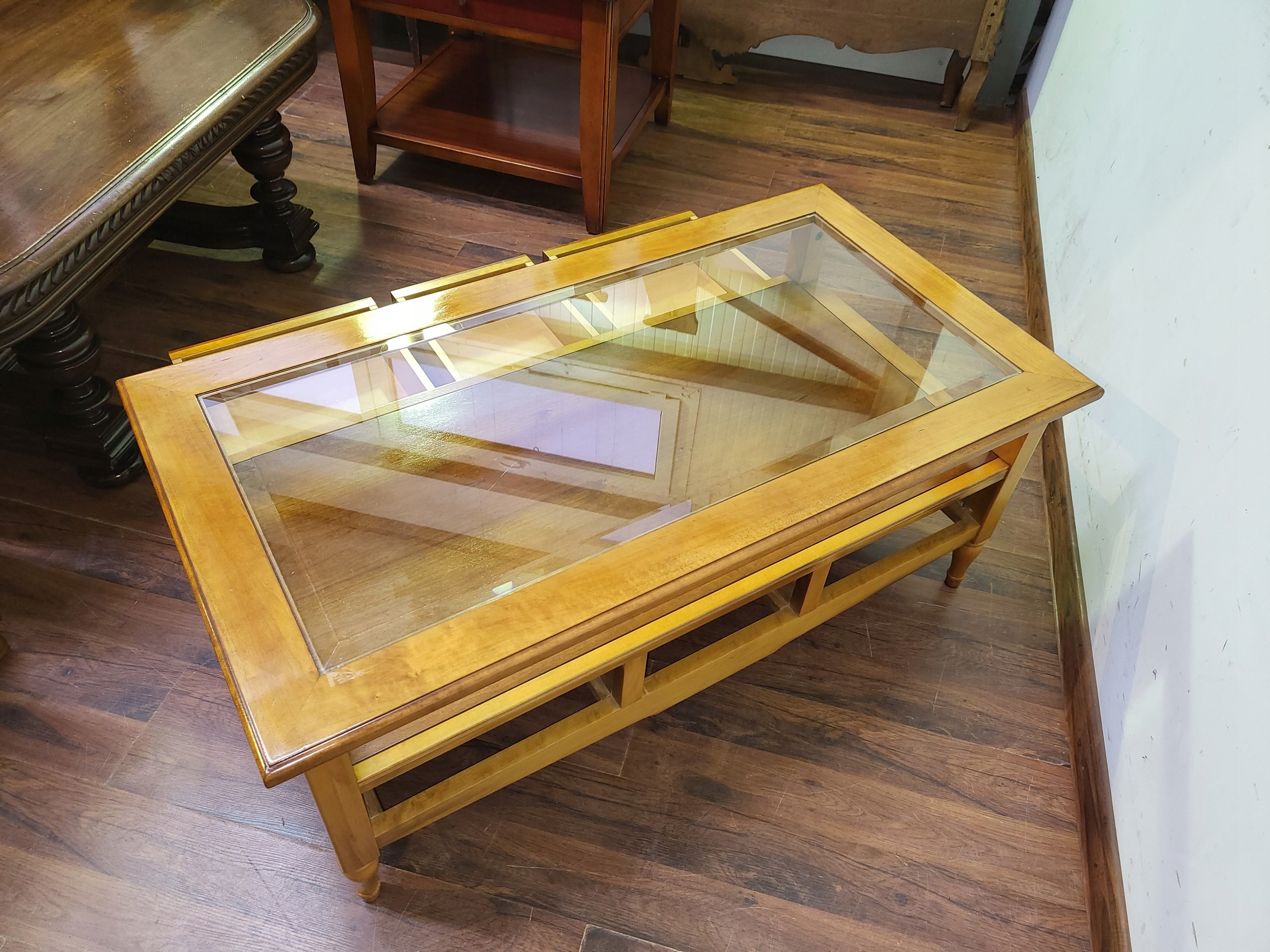 Гарний стильний журнальний столик. Країна виробник: Франція. Виготовлений з деревини бука. Стіл характеризується неймовірною елегантністю. Стан меблів дуже хороший, готові до розміщення. Скошене скло. Ящики з обох сторін.