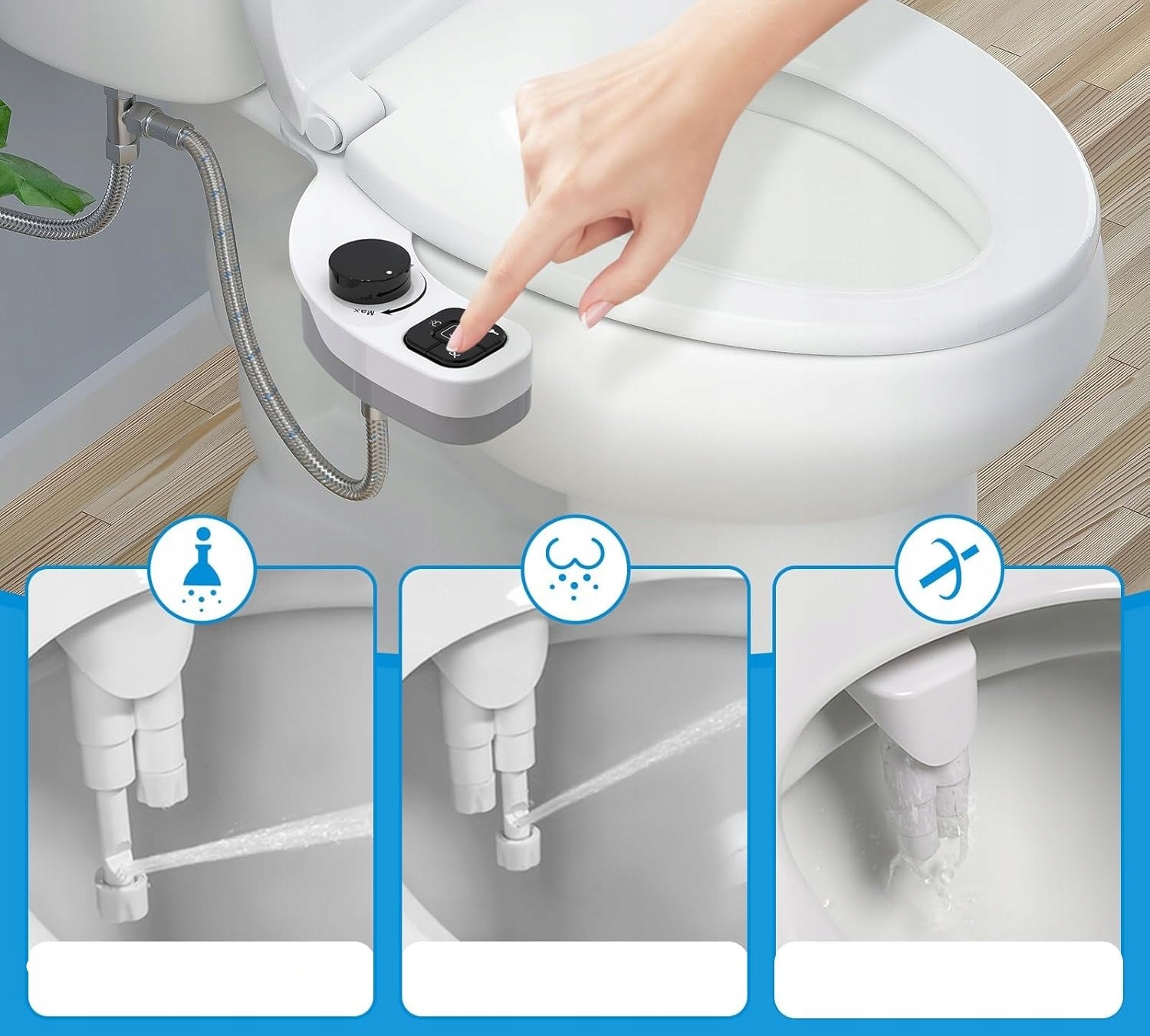 Насадка для біде має подвійні насадки, які забезпечують два режими розбризкування: очищення спереду для жінок, очищення ззаду для жінок і чоловіків.