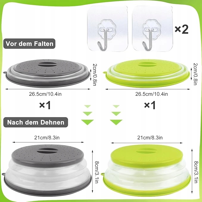 - СКЛАДАНА КОНСТРУКЦІЯ: можна розкладати, коли використовується, і складати, коли не використовується. До нашого продукту також входять два самоклеючі гачки, які можна використовувати, щоб повісити кришку мікрохвильової печі на стіну. Не займає багато місця, легко зберігати