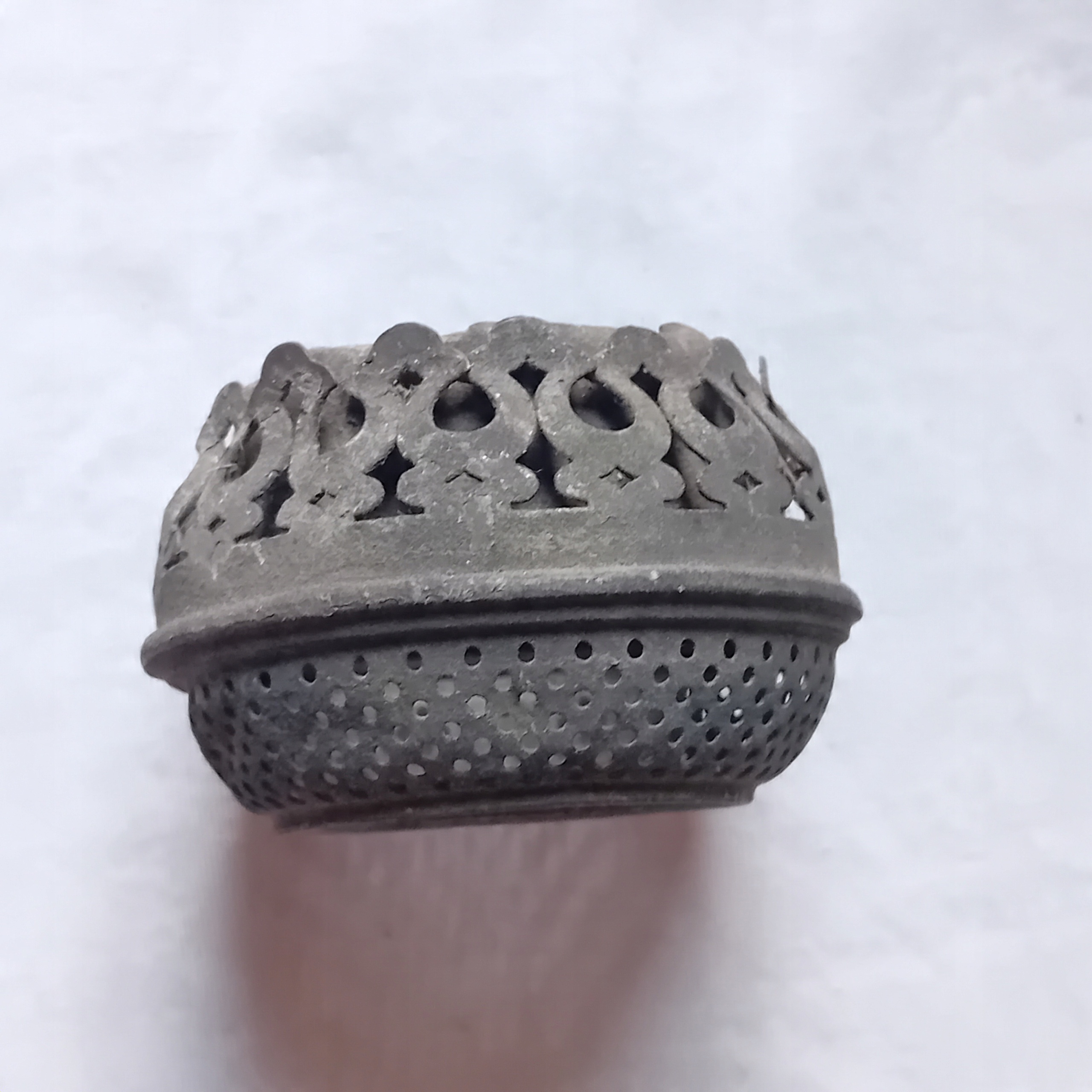 Продам антикварну латунну накладку (зовнішній елемент) для масляної лампи бренер початку 20 століття Елемент виготовлений з латуні, висота 5см. Діаметр зверху - 4,5 / 7 / 4,5 см. Монтажний діаметр для каміна - 5 см. Стан середній. Зверху є численні складки, які видно на фото. Один із зубів, що тримають камін, зламаний. На фото видно реальний стан.