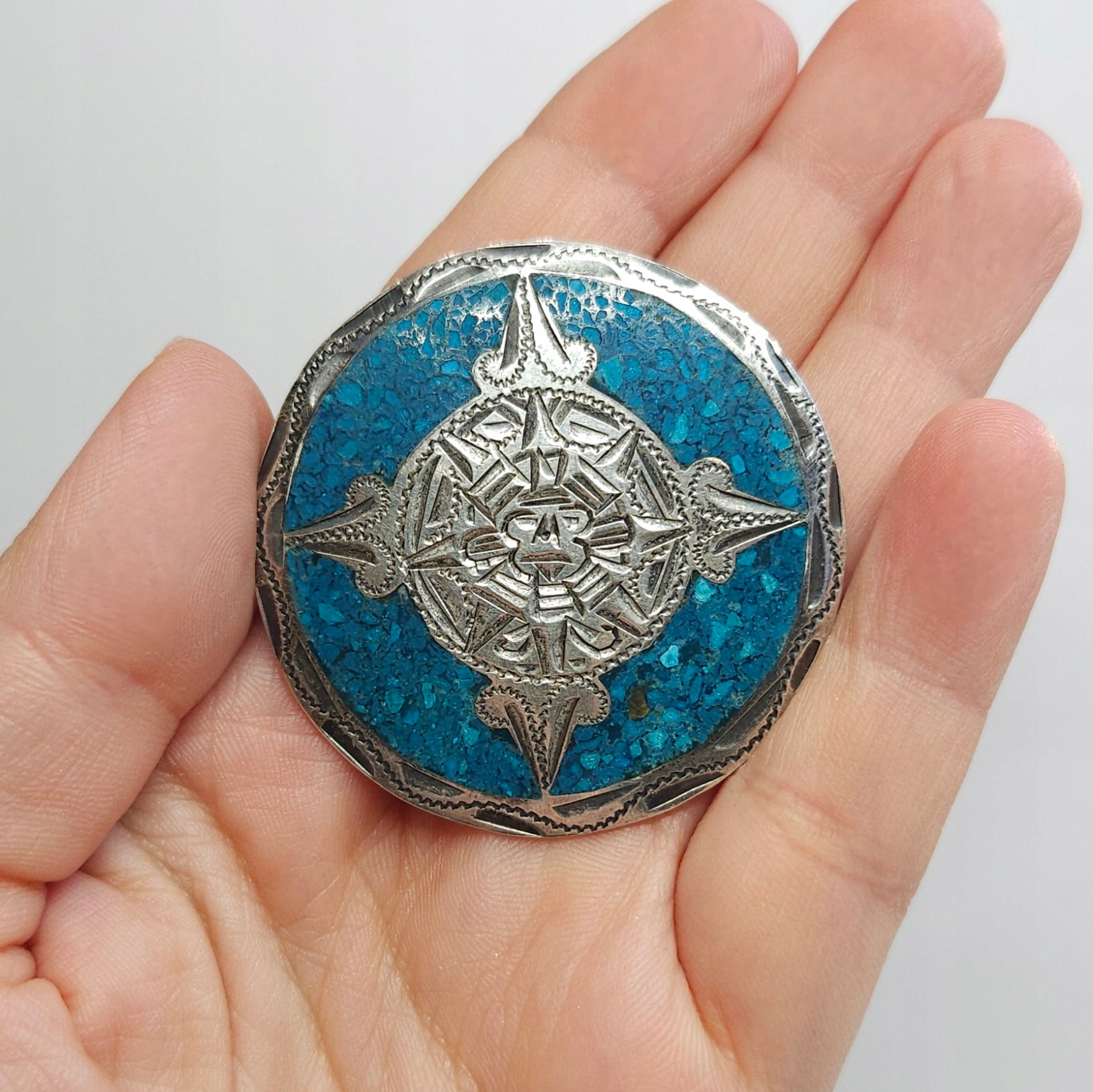 Предмет продажу велика кругла брошка - кулон, прикрашена бірюзовою мозаїкою, з ручним гравіюванням ацтекського мотиву