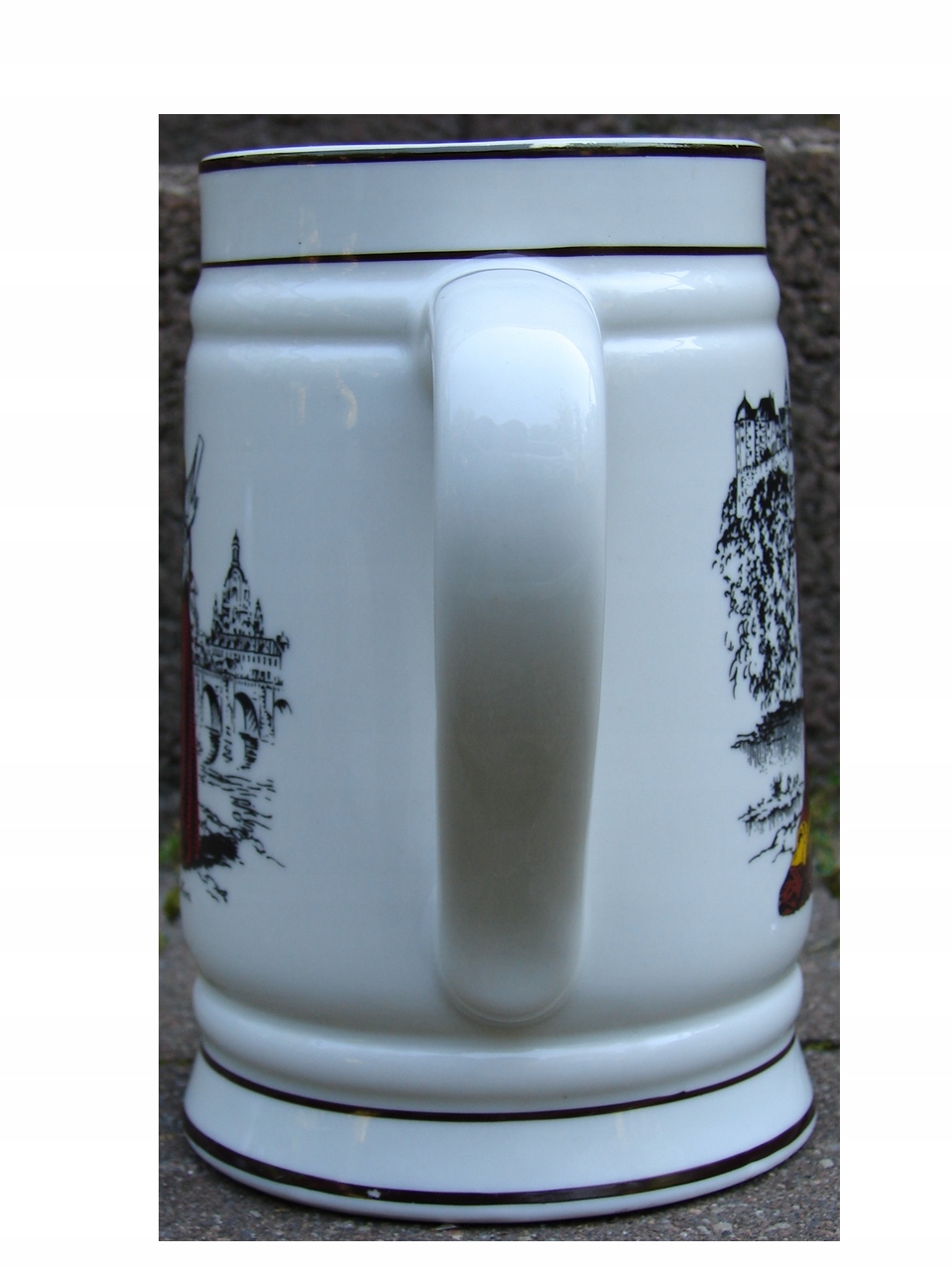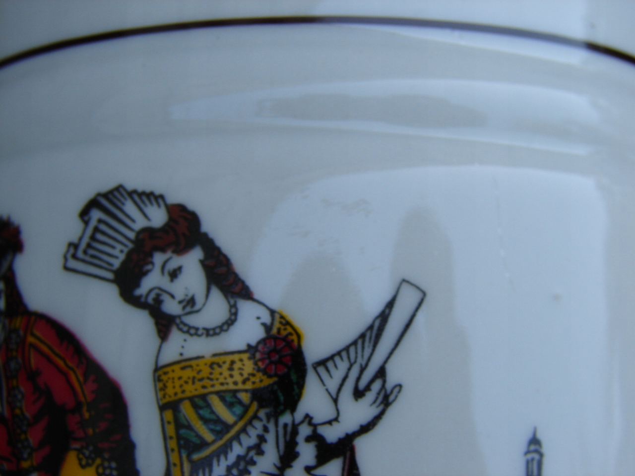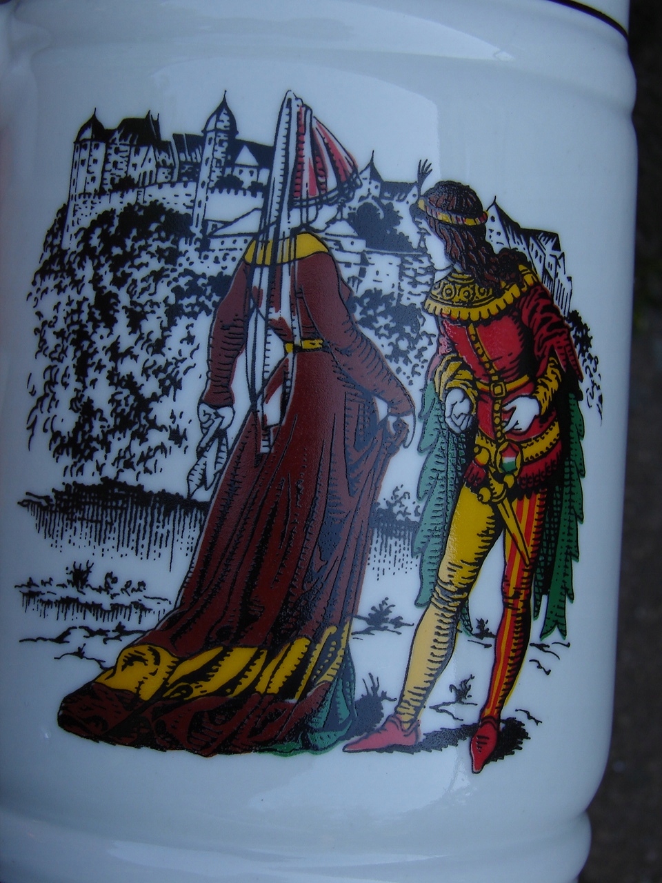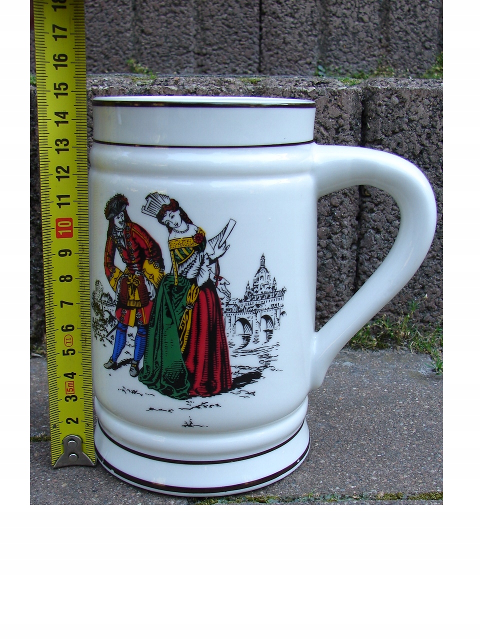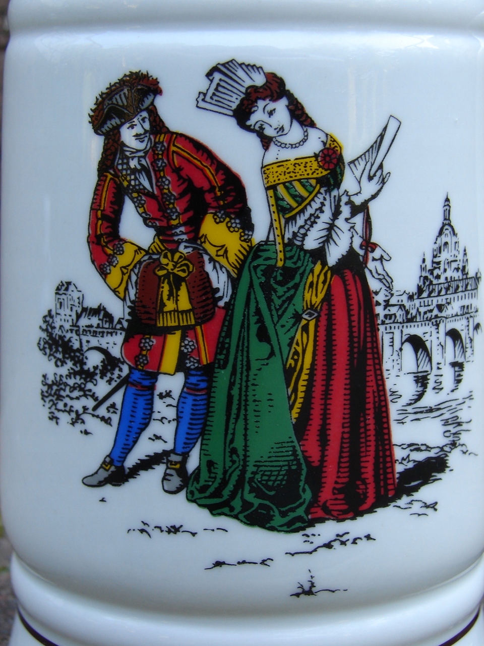 Друкована кухоль представляє жанрову сцену з двома персонажами в історичних костюмах та архітектурі на задньому плані.
