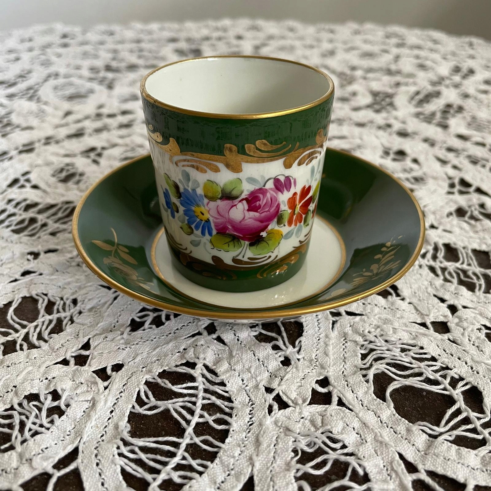 Зелений порцелян, розфарбований та позолочений квітковими мотивами. 10,5 см підставка