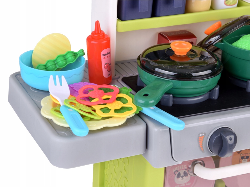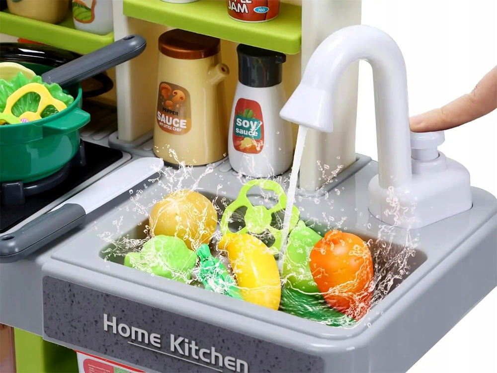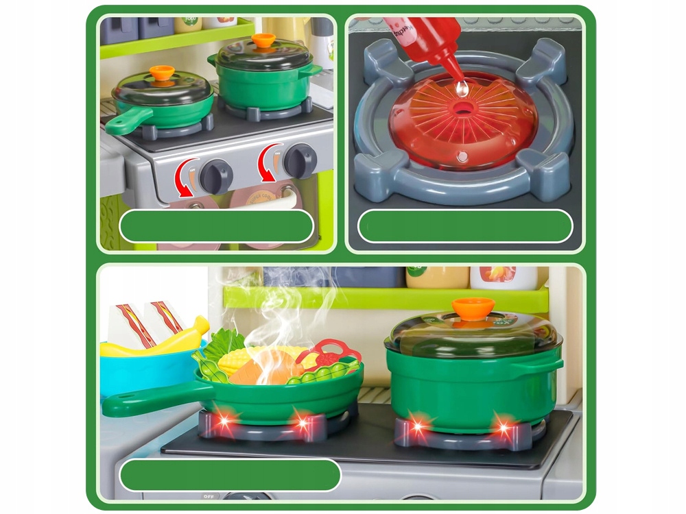 Гра з цією кухнею - це виняткова забава завдяки таким функціям, як освітлені пальники, кулінарні звуки та ефект пари, що плаває з горщиків, що імітує справжню приготування їжі. Діти також можуть "мити" посуд за допомогою крана води, що додає ще більшої справжності.
