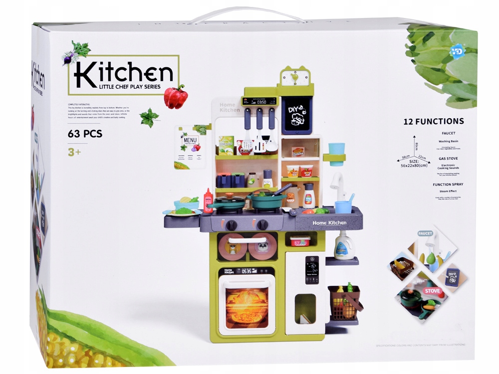 Гра з цією кухнею - це виняткова забава завдяки таким функціям, як освітлені пальники, кулінарні звуки та ефект пари, що плаває з горщиків, що імітує справжню приготування їжі. Діти також можуть "мити" посуд за допомогою крана води, що додає ще більшої справжності. Шафи, духовка або холодильник, зробіть у них діти, що зберігають свої кухонні аксесуари.