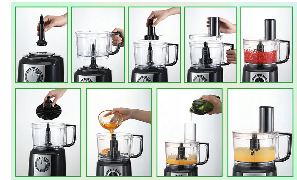 - 7 багатофункціональних аксесуарів: диск 3-в-одному, який можна нарізати скибочками, тонкою та грубою стрічками, а також дозволяє легко знімати та замінювати різні ножі. Ножем можна швидко подрібнити їжу і нарізати пластину м'яса або цибулі за десять секунд. Завдяки місильному диску вам більше не потрібно інтенсивно місити руками. Диск для емульгування швидко змішує яйця або вершки.