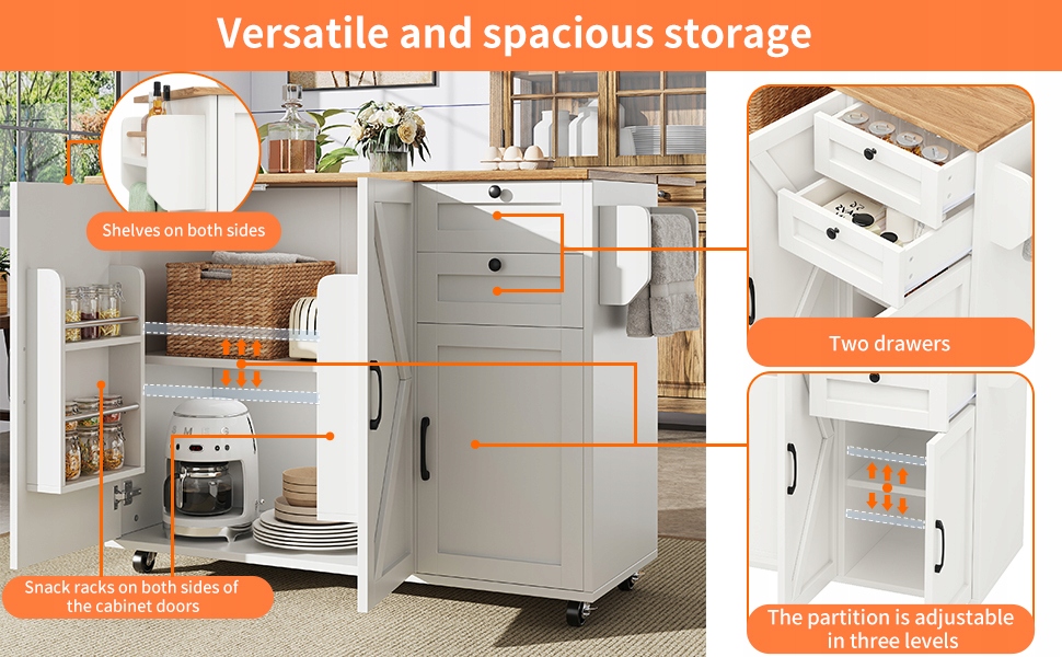 Універсальні рішення для зберігання: забезпечує просторий простір для зберігання з полицями з обох боків, двома ящиками та регульованими відсіками (три рівні), ідеально підходить для організації кухонних начиннях, страв на вечерю або статті ферми.
