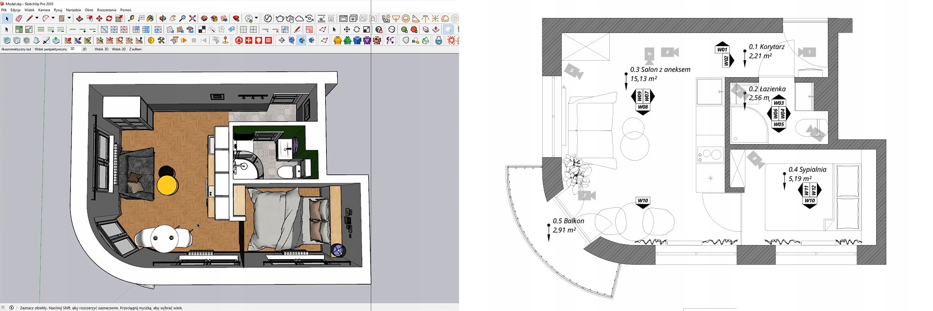 Курс починається з підготовки простої моделі невеликої квартири на основі плану поверху. Я поступово покажу вам, як створювати дедалі складнішу геометрію та як контролювати сцену на кожному рівні її просування. З самого початку я одночасно керую тривимірною сіткою та її проекцією на аркуш А4, щоб файли ідеально поєднувалися між собою.