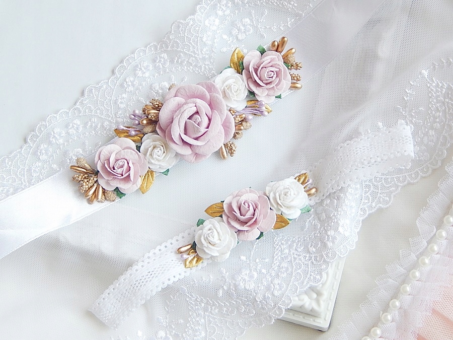 Пов'язка на декоративній білій гумці, прикрашена ніжними квітами. Його нерозтягнутий окружність становить приблизно 36 см