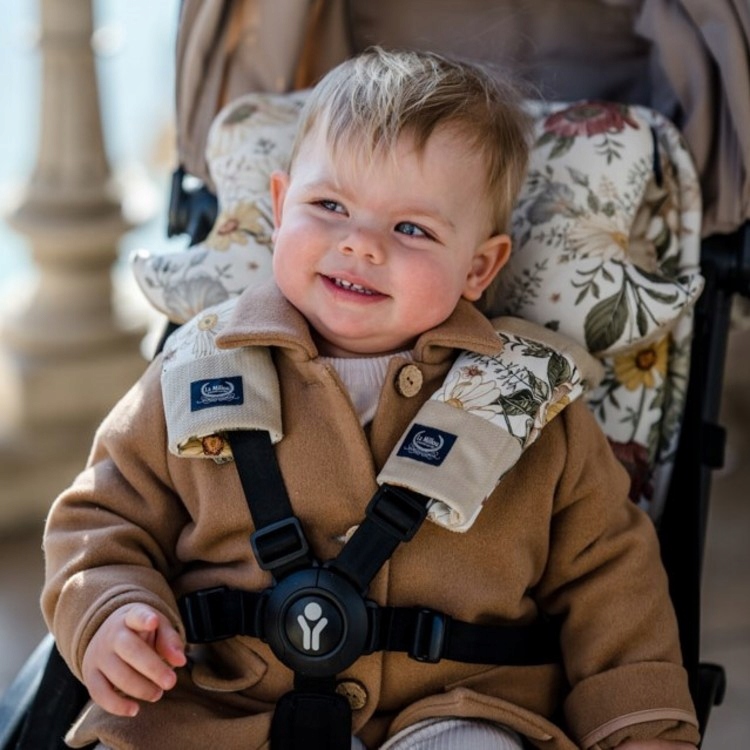 Вставка оснащена сумісною з більшістю колясків Система отворів для ременів та з двома гнучкими еластичними, що дозволяє прикріплювати продукт за кілька секунд.