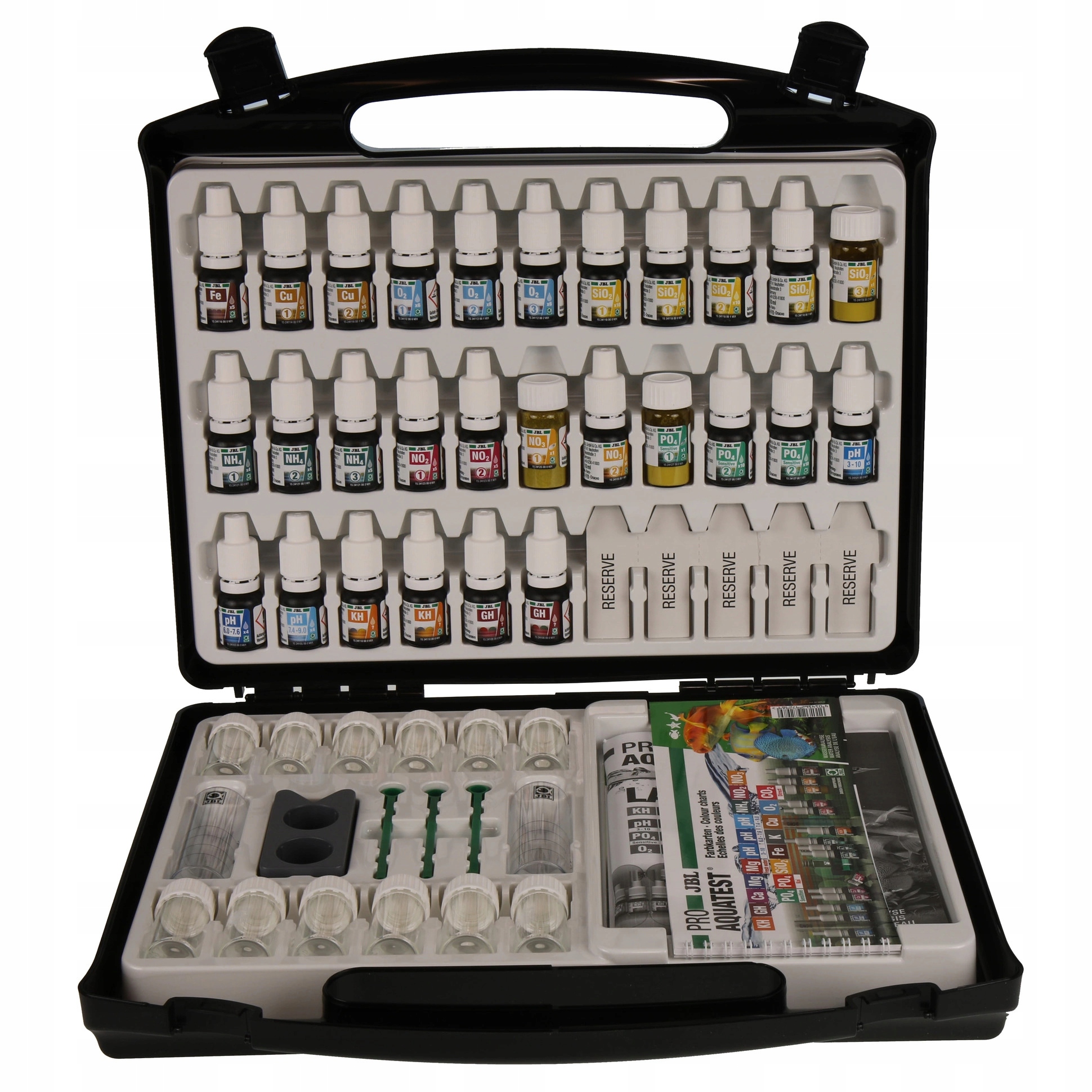 Правильні параметри води в акваріумі залежать від лиття риби і рослини. Крім того, якщо вода виглядає прозорою, вона може бути забруднена. З поганими значеннями можуть утворюватися захворювання або водорості в акваріумі. Для здорового акваріума з майже природними умовами важливо регулярно контролювати та регулювати параметри води. Завдяки тестам на воду JBL ви можете швидко, просто і дуже точно визначити всі важливі параметри води. Визначені параметри: значення рН (3 діапазони), твердість карбонату, загальна твердість, аммон/аміак, нітрити, нітрати, фосфати, залізо, мідь, силікат, кисень та обчислення СО2 з таблиці
