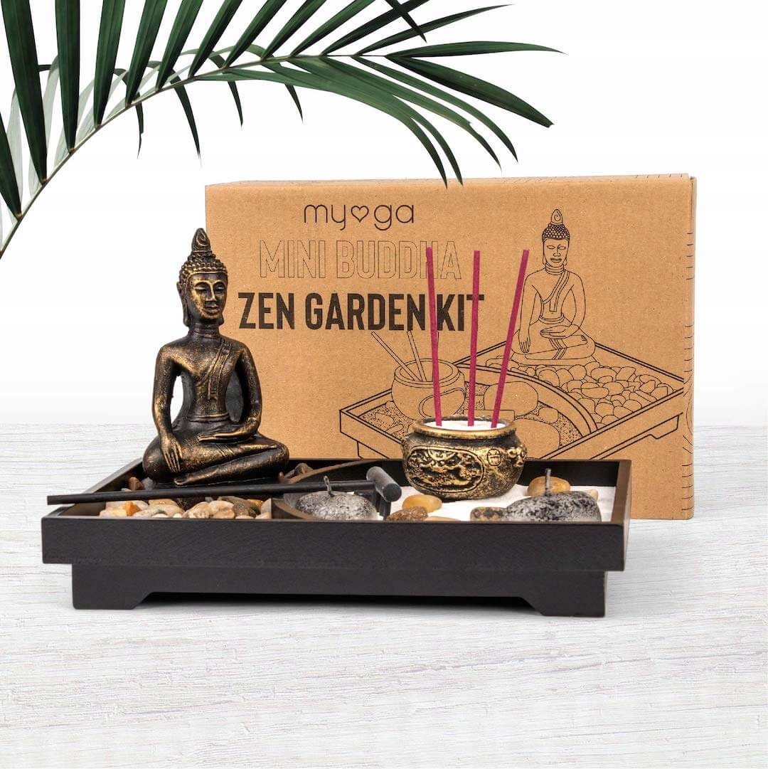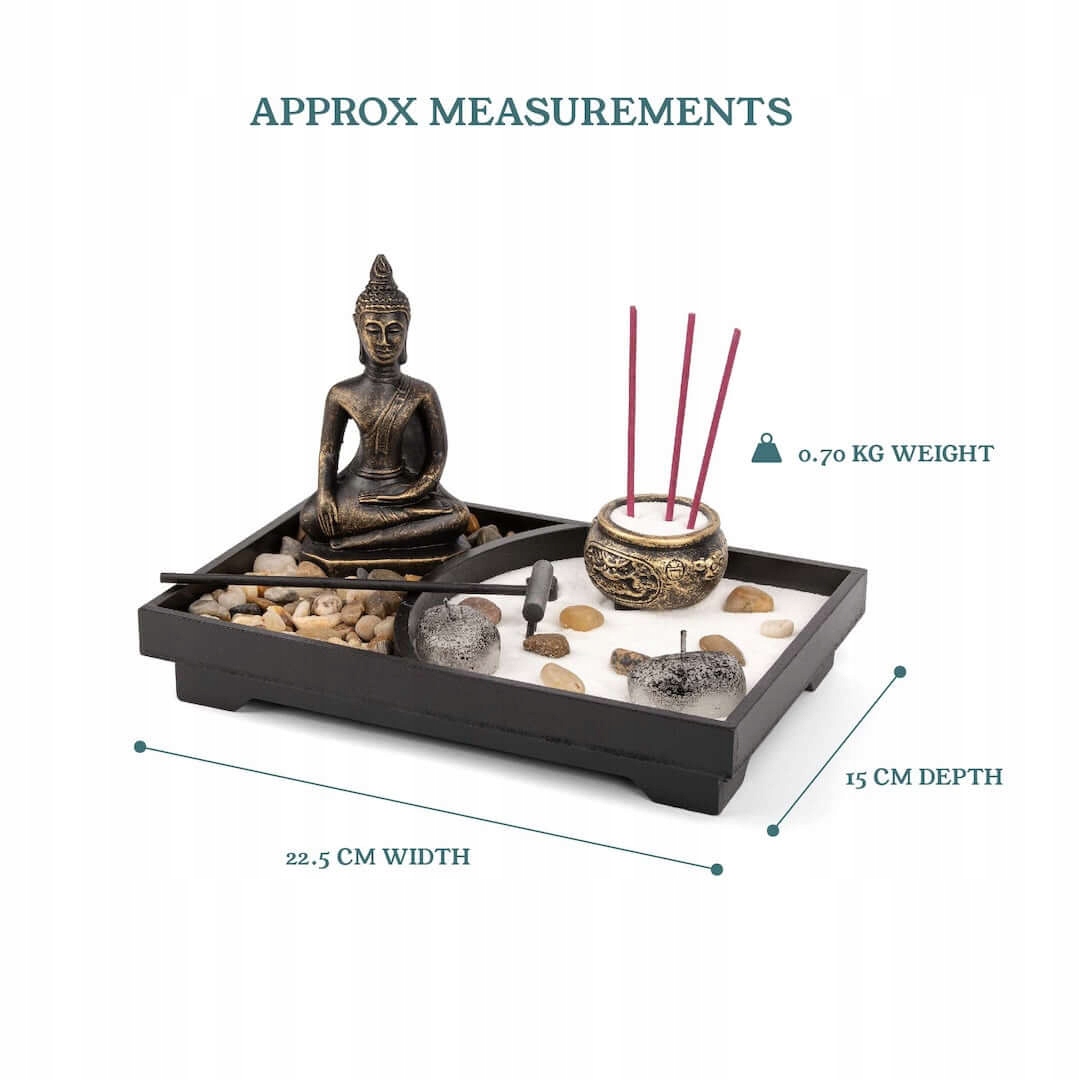 Створіть заспокійливу атмосферу в цьому привабливому дзен-саду з орнаментом Будди. Використовуйте граблі, що входять у комплект, щоб освоїти заспокійливу навичку згрібання піску під час догляду за садом.