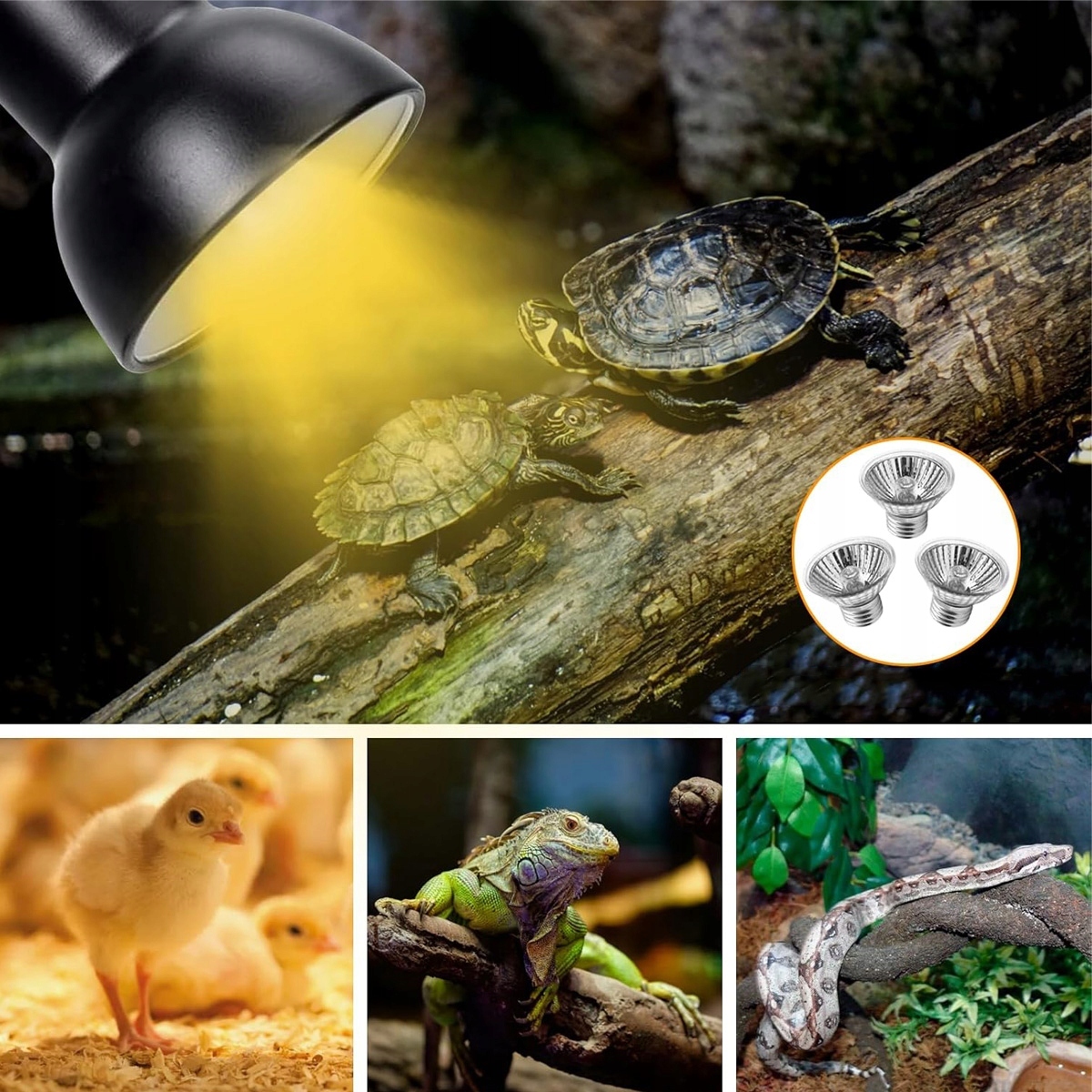 �� обмінні цибулини E27: 1 x 25 W + 2 x 50 у лампах рептилій (3 нагрівальні лампи), світла UVA (видимого світла) (світло UVB) і тепло. Антиоксидант і анти -кум, і скляна вакуумна трубка була використана для продовження терміну експлуатації лампи. Вплив сонця та зневоднення, не потрібно входити та залишати, дозволяє черепаху рости в комфортному середовищі. Використовується: використовується в різних рептилій та земноводних, включаючи черепахи, ящірки, бородатих драконів, змій, жаб, legwanów, черепахи, чаквали тощо