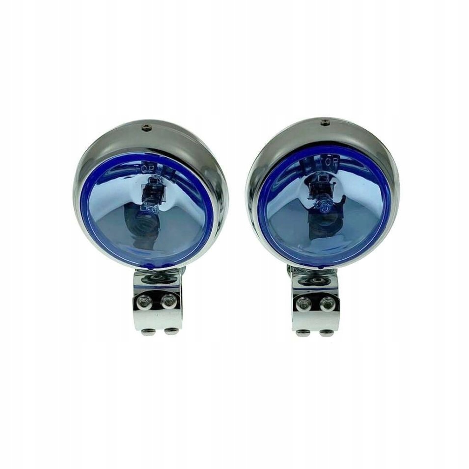 - Лампи та затискачі хромовані. Абажур світло-блакитний. Вони оснащені лампочками H3 12V 55W. Хомути дуже міцні, кріпляться з трьох частин. Набір дозволяє монтувати ліхтарі на передню дугу і регулювати кут падіння світла.