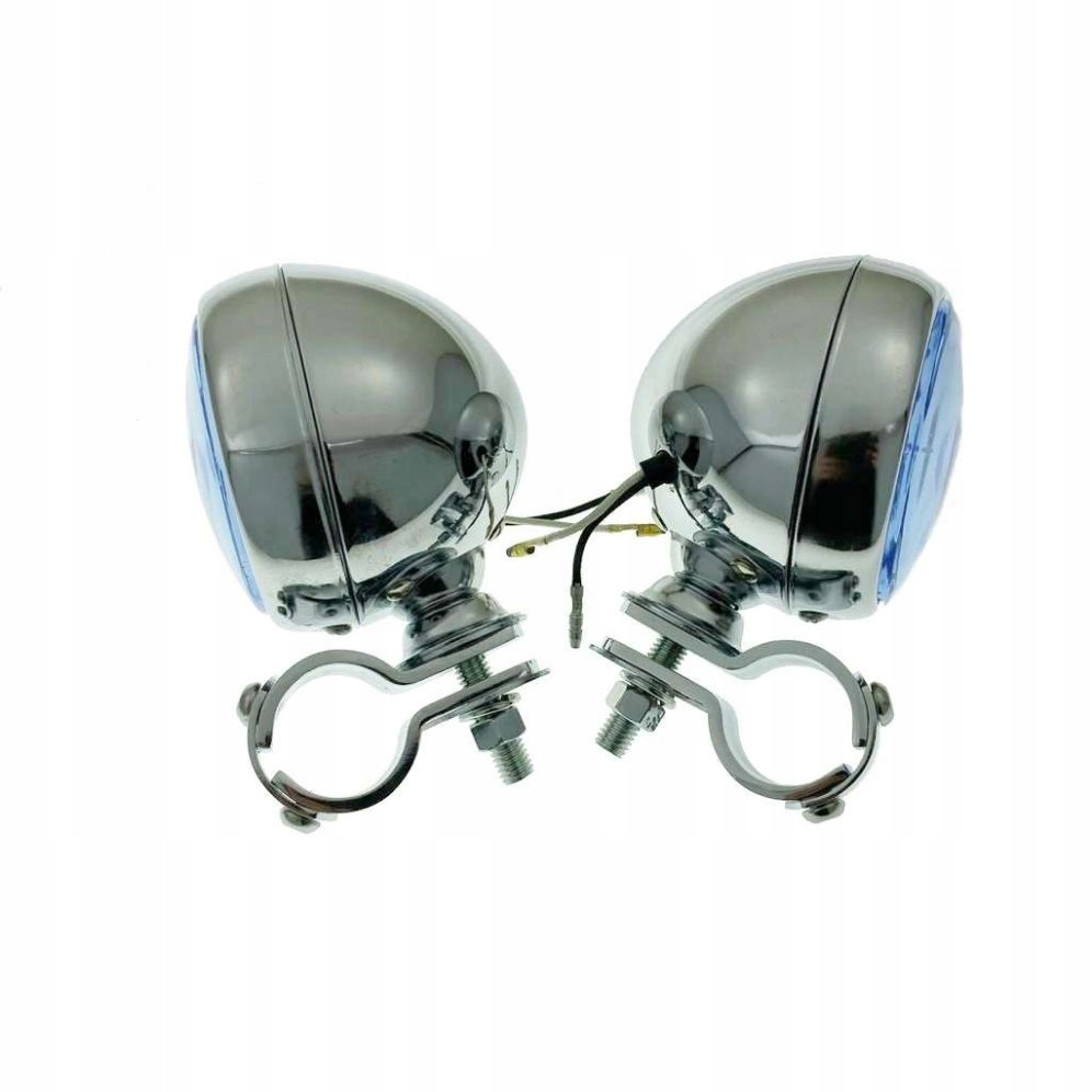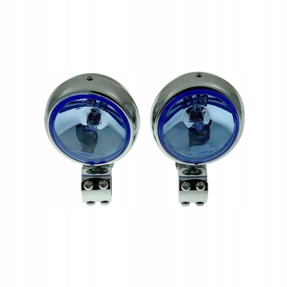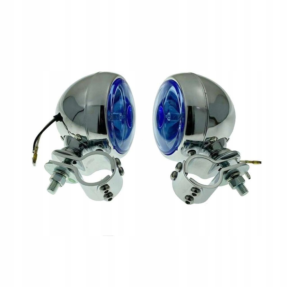 - Лампи та затискачі хромовані. Абажур світло-блакитний. Вони оснащені лампочками H3 12V 55W. Хомути дуже міцні, кріпляться з трьох частин. Набір дозволяє монтувати ліхтарі на передню дугу і регулювати кут падіння світла.