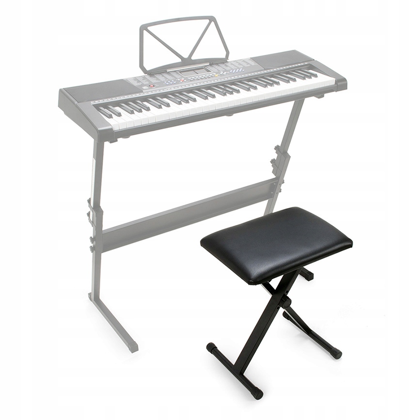 Світло та комфортна табуретка, яку ми можемо використовувати під час гри на піаніно, клавіатурі чи іншому інструменті (наприклад, гітара). Зроблений з алюмінію та пластмас, він дуже довговічний і естетично зроблений. Невикористаний, він складається рівним і займає невелике місце - ви можете приховати його, наприклад Під ліжком або за полицею - вона не займеться займати місце або знищить.