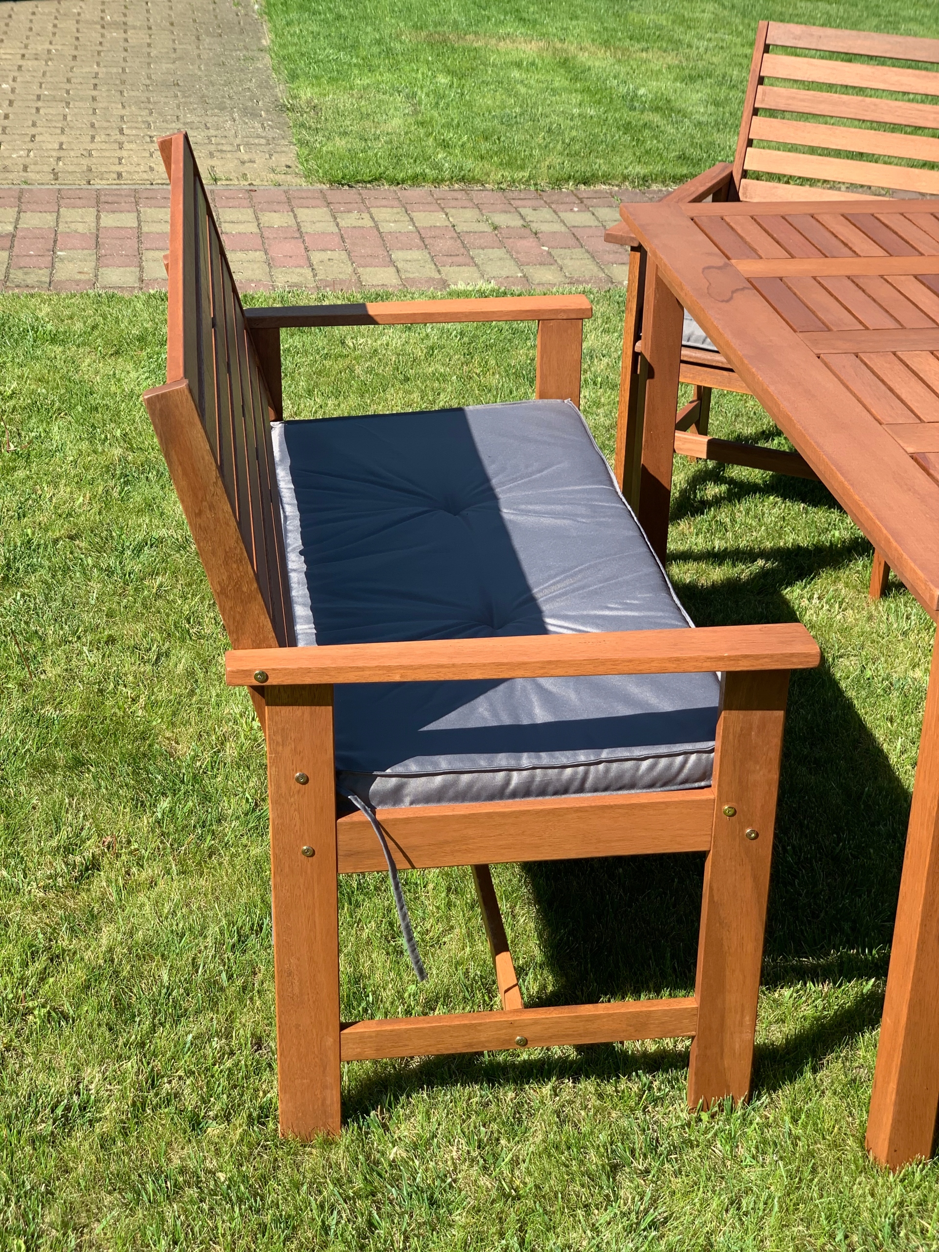 Лавки Касабланка виготовлені з деревини Меранті, яка має високу стійкість до погодних умов. Подушки для лавок можна придбати на окремих аукціонах (доступні в двох кольорах). Ідеально підходять для терас, балконів і садів.